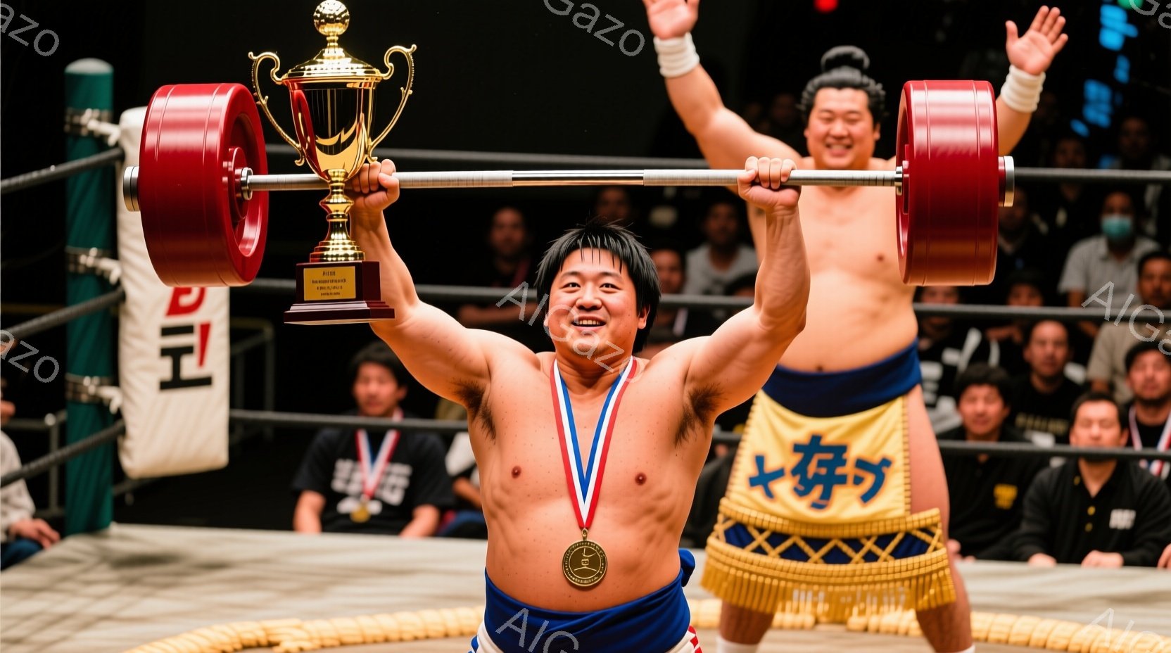 この無料AI生成画像「屈強な体格の力士が、土俵上で両手を高く上げ、勝利を喜んでいます。彼は紺色の廻しを身につけ、首には金色のメダルと赤いリボンがかけられています。背景には観客席が広がり、多くの人々が彼を見守る中、勝利の喜びが伝わってきます。」は、2025年10月23日に作成されました。 サイズは 1664×928px の高解像度で、商用利用も可能なフリー素材として提供しています。