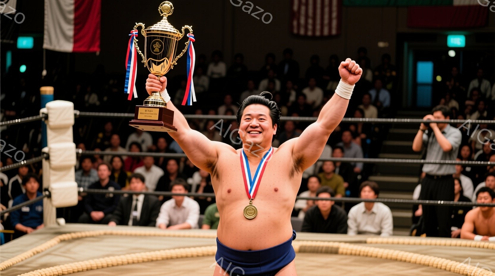 力士が土俵上でトロフィーを高々と掲げており、満面の笑みを浮かべている。彼はまわしを着用し、首には金色のメダルが掛かっている。背景には、スーツ姿の人々が整然と並んでおり、勝利を祝う熱気を感じさせる。