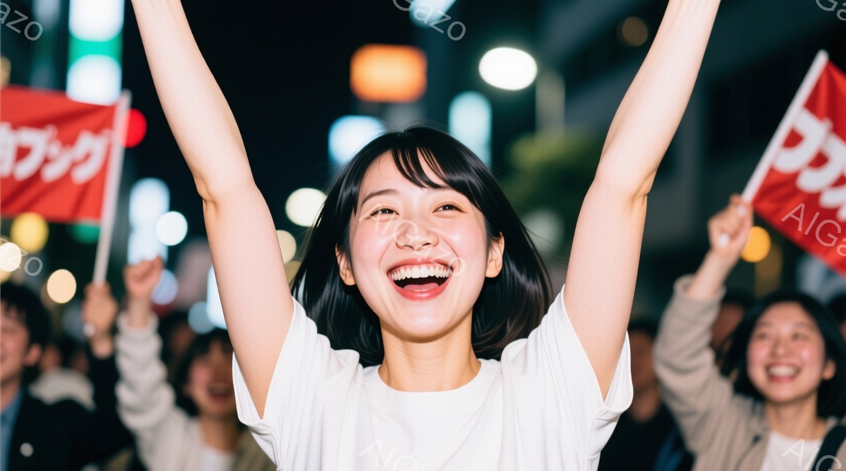 黒髪の短いヘアスタイルで、白いトップスを着た女性が、両手を高く上げて笑顔で写っています。背景にはイギリス国旗を持つ人々と建物が見え、晴天の下で賑やかな雰囲気です。女性の表情は喜びにあふれ、イベントやお祝いの場面であることが伺えます。