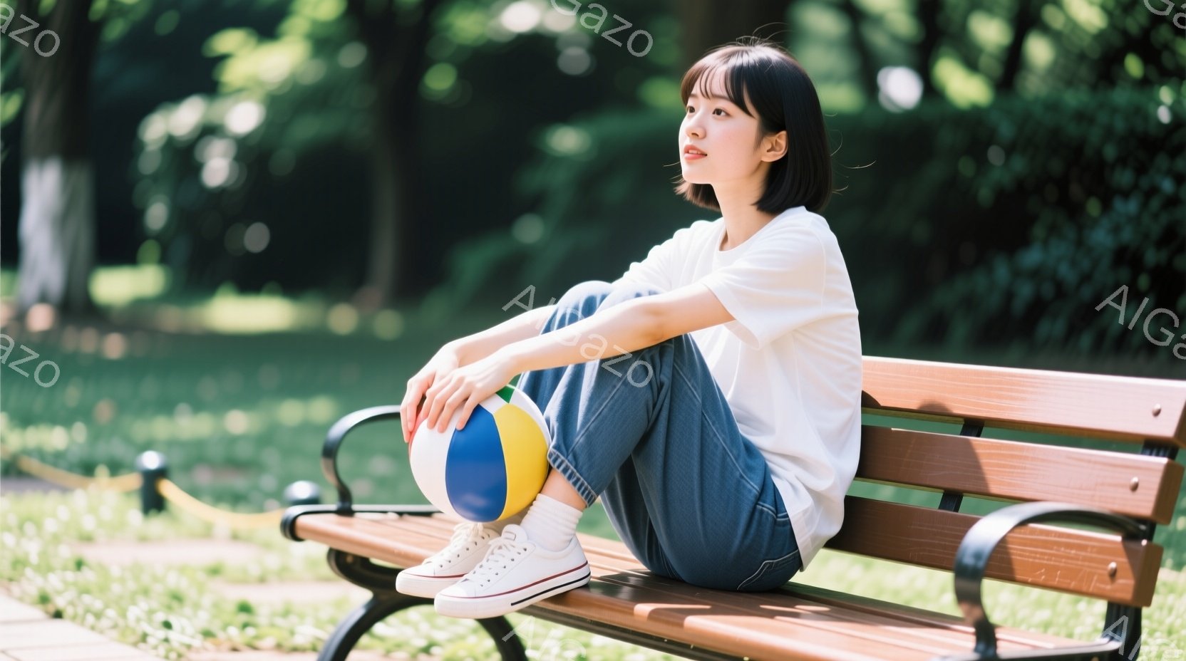 短い黒髪の女性が公園のベンチに座っており、白いTシャツとジーンズを着用しています。彼女は少し物憂げな表情で遠くを見つめ、膝の上にカラフルなボールを乗せています。背景には緑豊かな木々と歩道が見え、晴れた日の穏やかな雰囲気が漂っています。