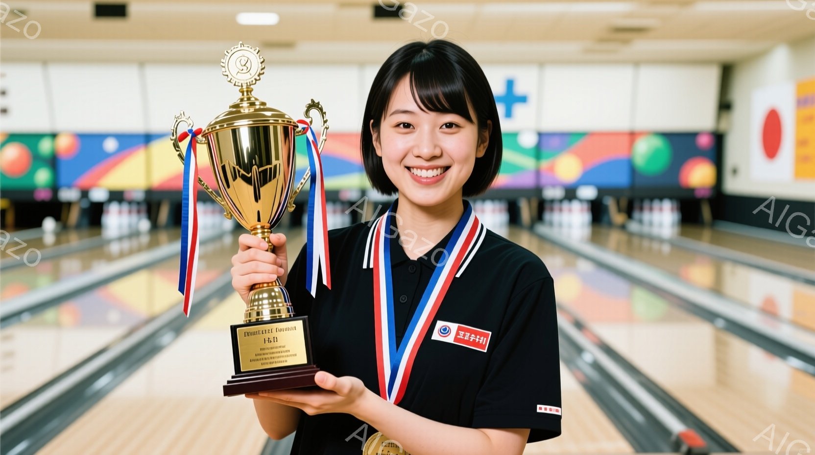 若い女性がボウリング場のレーンでトロフィーを高く掲げています。彼女は白いシャツにネイビーのベスト、そしてメダルを身につけ、明るい笑顔を見せています。背景にはボウリングのレーンとカラフルな装飾が写っており、勝利を祝う華やかな雰囲気が漂っています。