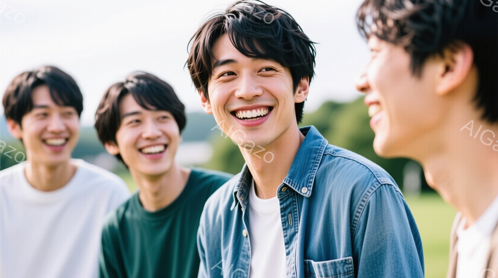 4人の若い男性が写っており、皆笑顔で楽しそうにしている。左から順に、黄色のジャケットを着た男性、水色のシャツを着た男性、デニムシャツを着てリュックを背負った男性、そして横顔の男性がいる。背景には緑の芝生と木々が見え、晴天の屋外で撮影された温かい雰囲気の画像である。