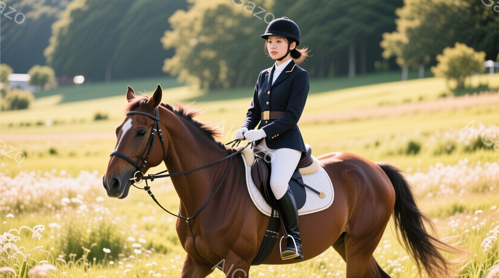 若い女性が茶色の馬に乗って草原を歩いている様子が写っている。彼女は濃い青色のジャケット、白いズボン、黒いヘルメットを着用し、髪は後ろで三つ編みにしている。背景には緑の丘と、遠くに見える建物があり、天候は晴れで、全体的に穏やかで自然な雰囲気が漂っている。