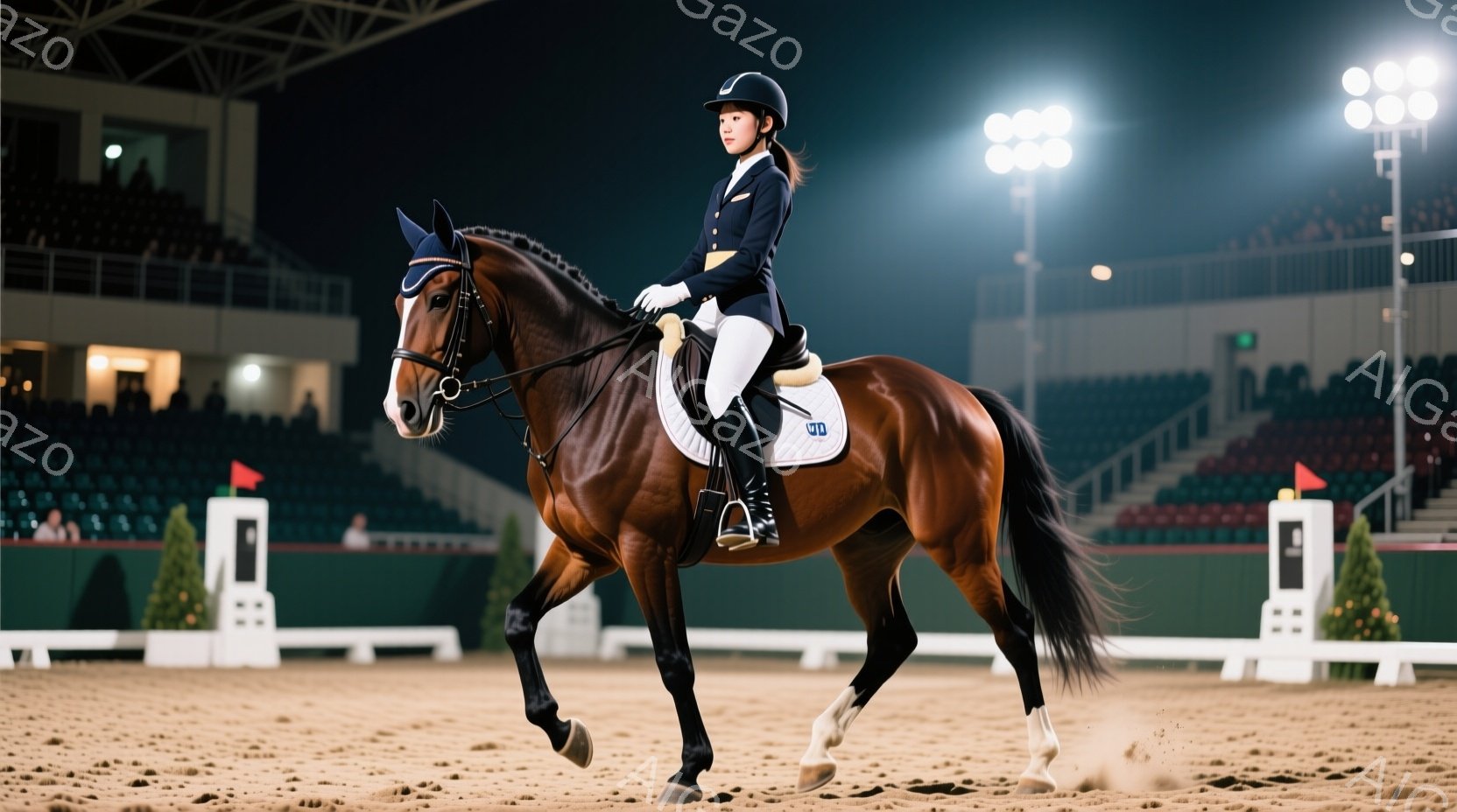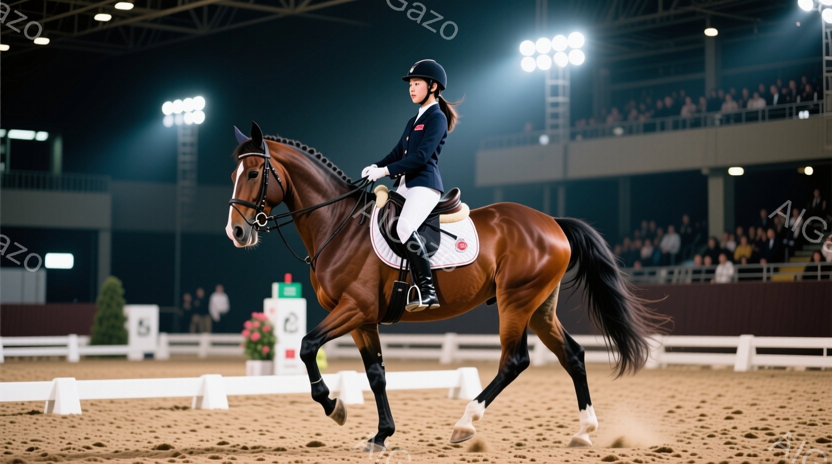 栗色の馬に乗った女性競技者が競技場を堂々と歩いている。彼女は黒いヘルメットとジャケット、白いズボン、膝丈のブーツを着用し、髪は後ろでまとめられている。競技場は観客席で埋め尽くされ、競技用の障害物が設置されており、夜間の照明が明るい雰囲気を演出している。