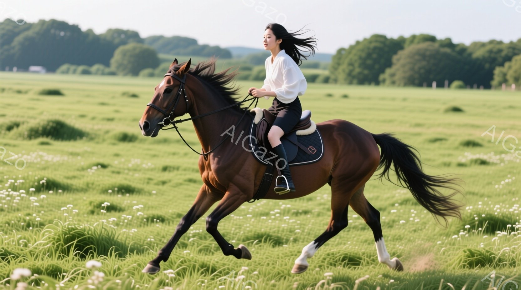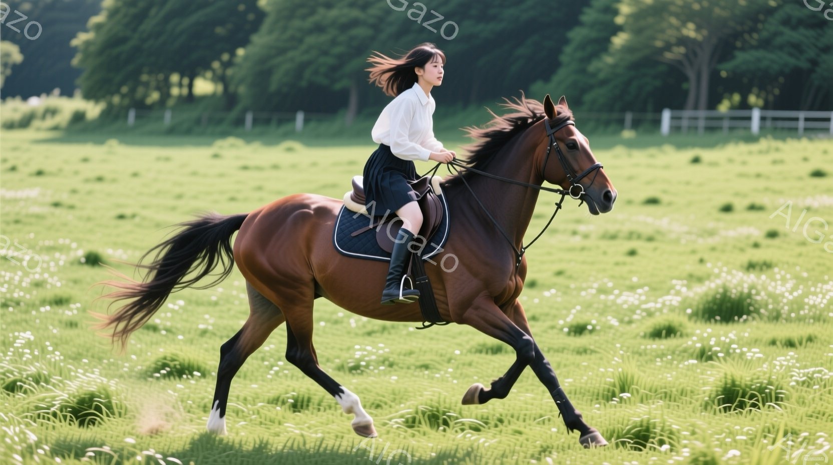 栗色の馬が緑豊かな草原を疾走している。女性は白いズボンと濃い青色のジャケットを着用し、髪は風になびいている。背景には白いフェンスと緑の木々が見え、晴れた日の穏やかな雰囲気を醸し出している。