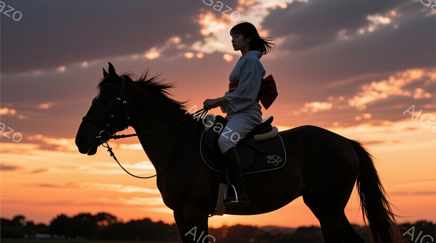 黒い馬に乗った女性がシルエットで描かれている。彼女は白いシャツと濃い色のズボンを着用し、髪は後ろで結ばれている。背景は夕焼けに染まり、空はオレンジ色と紫色のグラデーションで、馬と女性の姿を際立たせ、静かで力強い雰囲気を醸し出している。