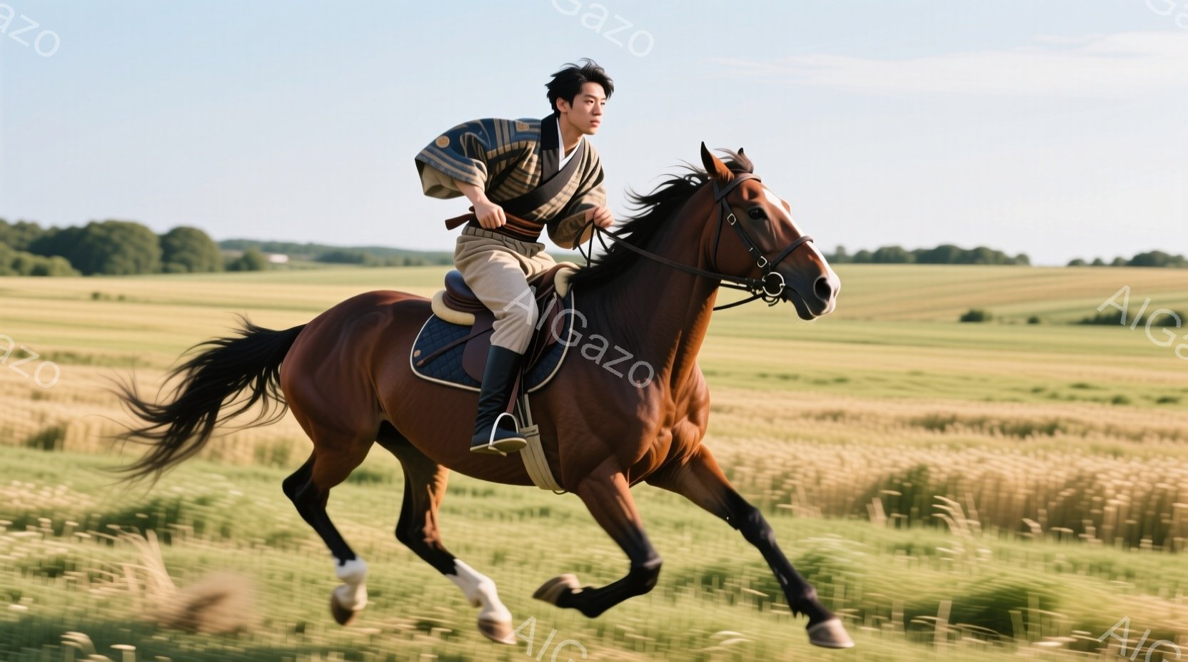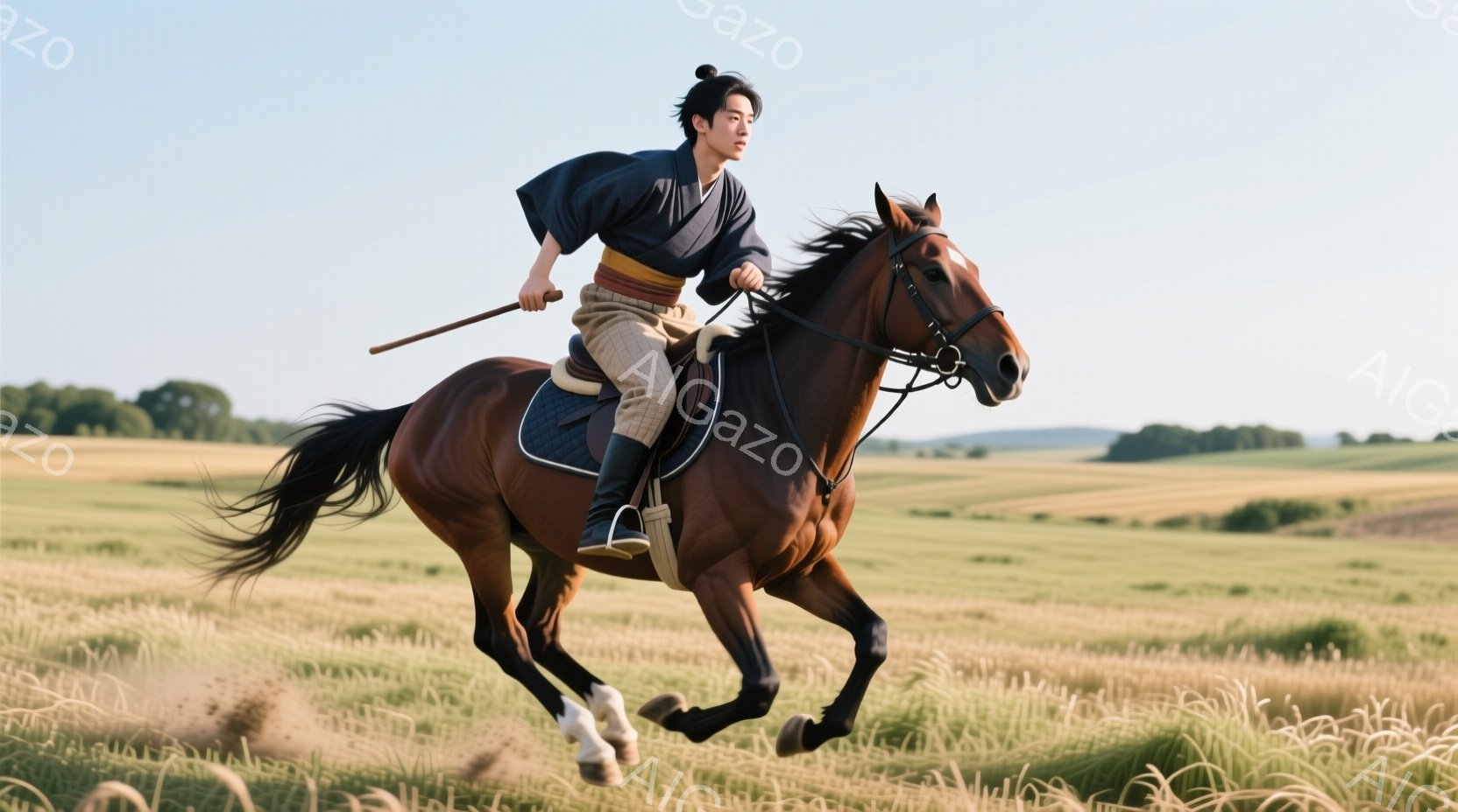 広大な草原を栗色の馬が疾走している。男性は藍色の着物のような上着とクリーム色のズボンを着用し、黒髪を後ろで束ねている。背景には緑豊かな木々が見え、晴天の下、馬と男性は力強く草原を駆け抜けている様子が、躍動感と開放感を漂わせている。