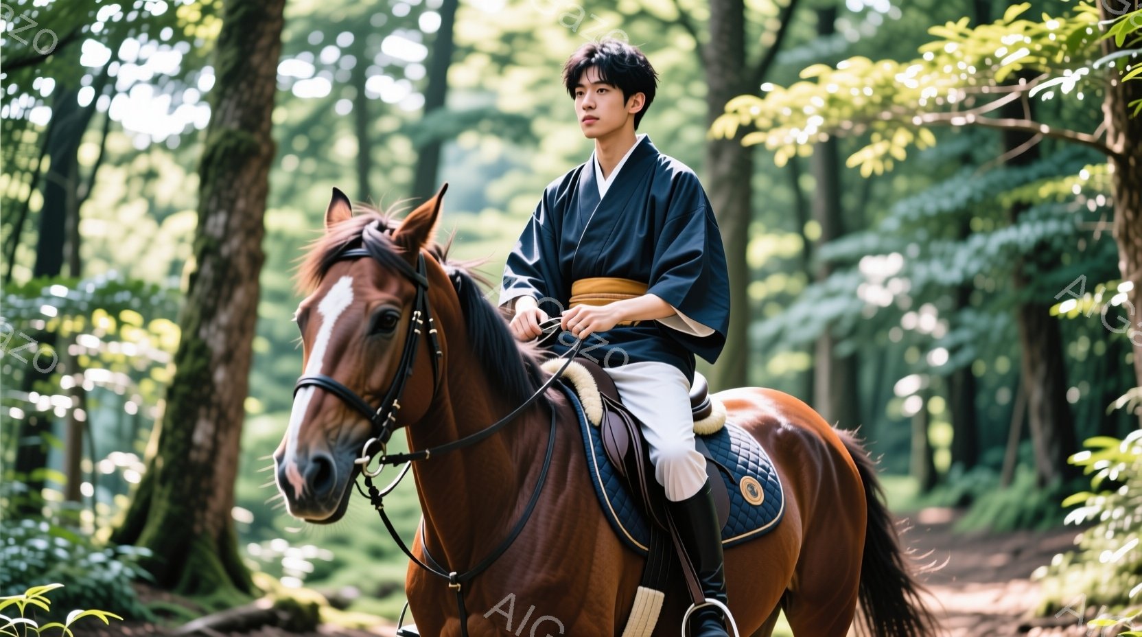 若い男性が栗色の馬に乗って森の中を歩いている。彼は白いシャツに濃い青色のジャケットとベージュ色のズボンを着用し、黒髪を短く整えている。背景は緑豊かな木々に囲まれた明るい森で、穏やかで静謐な雰囲気が漂っている。