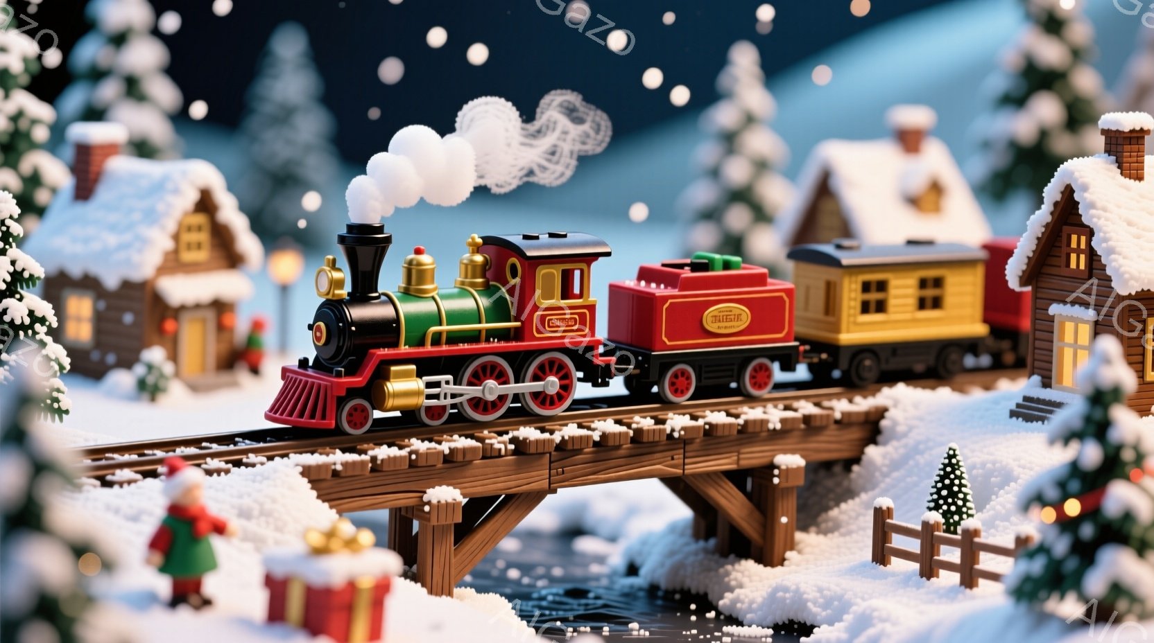 雪の降る夜、おもちゃのような蒸気機関車が木製のアーチ橋の上を走っています。周囲には雪で覆われた小さなお家やクリスマスツリー、プレゼントの箱が配置され、暖かく幻想的な雰囲気を醸し出しています。夜空には星が輝き、全体的に温かく、遊び心あふれるクリスマスの情景が広がっています。