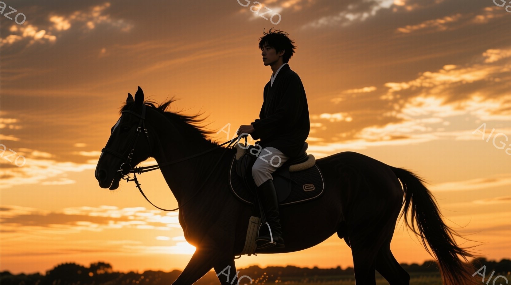 黒い馬に乗った男性がシルエットで描かれている。彼は白いズボンと黒いジャケットを着用し、髪は短く整えられている。背景は夕焼けで、空はオレンジと黄色のグラデーションで、穏やかで幻想的な雰囲気を醸し出している。