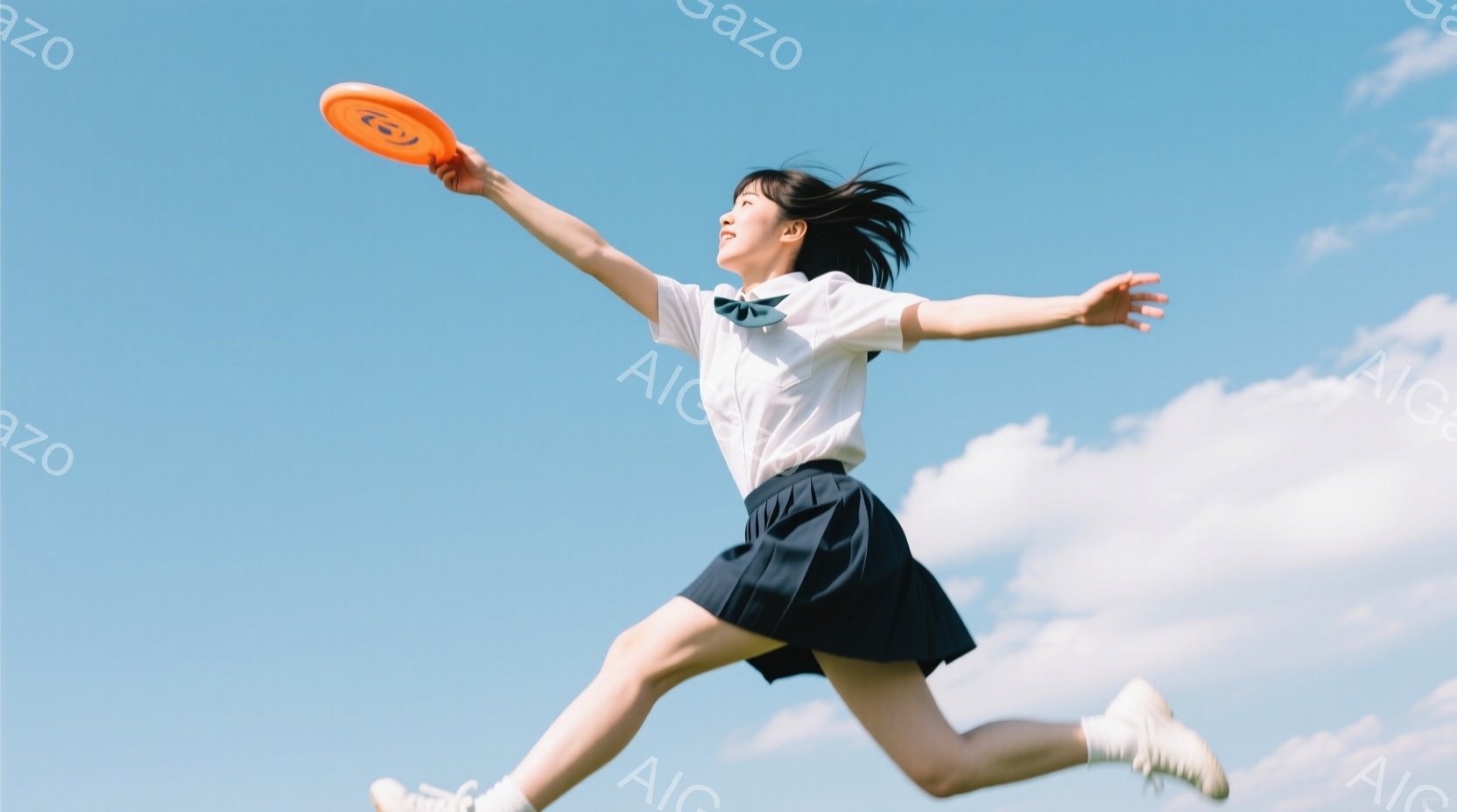 制服を着た若い女性が、青い空を背景に空中でディスクを投げようとしています。彼女は紺色のプリーツスカートと白いブラウス、赤いリボンネクタイを着用しており、髪はポニーテールに結ばれています。躍動感のある姿勢と表情から、楽しさと活気が伝わってきます。