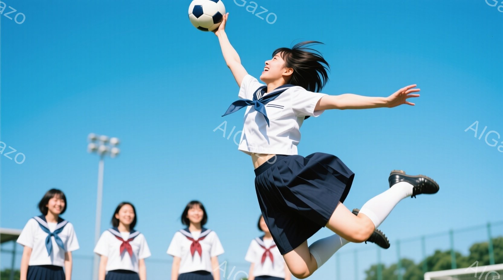 制服姿の女子高生が、サッカーボールを高く蹴り上げる瞬間を捉えた写真です。彼女は紺色のスカートと白いブラウス姿で、空中で体を大きく広げ、左足を大きく上げてボールに触れています。背景には青空と緑の芝生が広がり、他の制服姿の女子生徒たちも写っており、活気のある部活動の様子が伝わってきます。