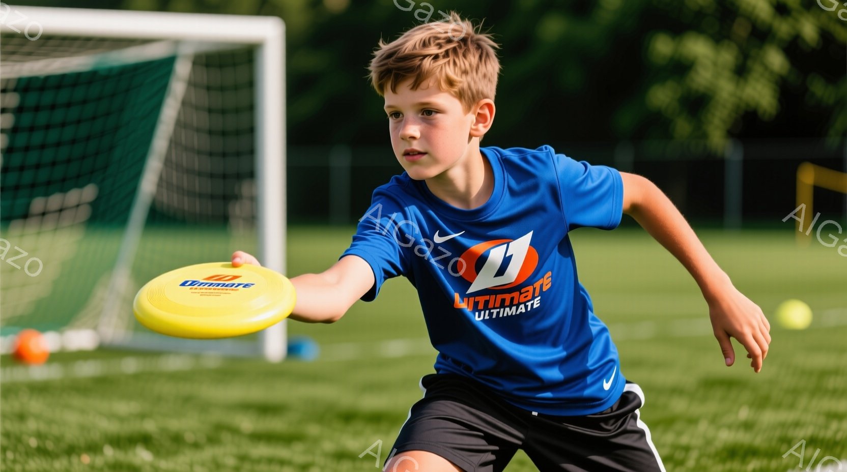 少年は青いTシャツと黒いショーツ姿で、黄色いフリスビーを投げようとしています。彼の髪は短く明るい茶色で、顔にはそばかすがあります。背景には緑の芝生とサッカーゴールが見え、晴れた日の屋外で活気に満ちた雰囲気です。