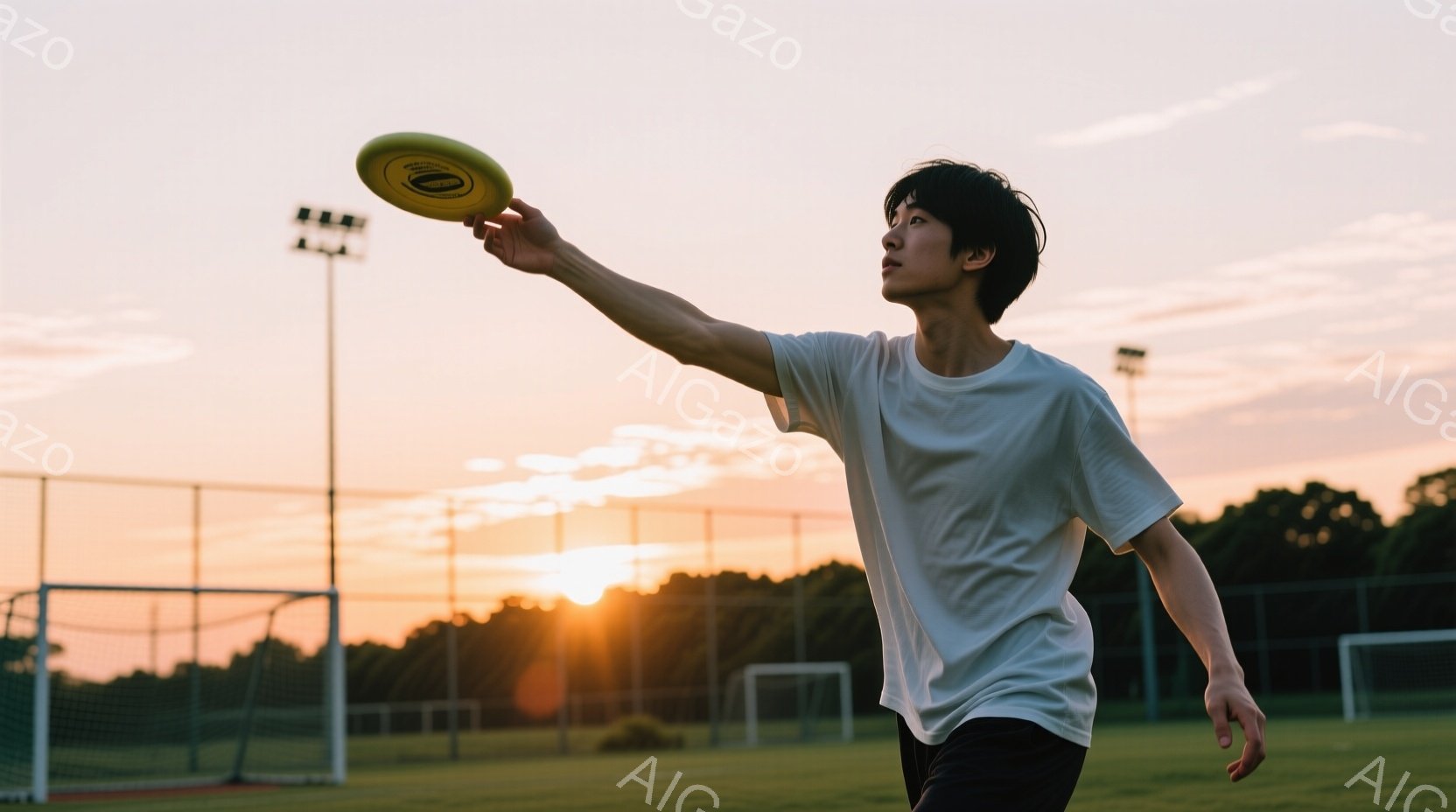 若い男性が夕暮れ時のサッカー場にて、フリスビーを投げようとしている瞬間を捉えた写真です。彼は薄い緑色のTシャツと黒い短パンを着用し、少し長めの髪を無造作にしています。背景にはサッカーゴールや緑豊かな木々が見え、空はオレンジとピンクのグラデーションで、穏やかで暖かい雰囲気を醸し出しています。