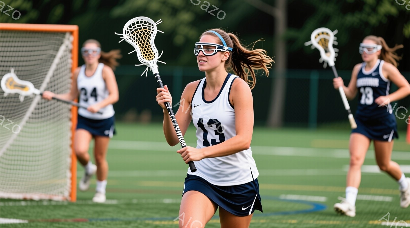 ラクロスをする若い女性選手が写っている。彼女は紺色と赤色のストライプが入った白いユニフォーム、白いソックス、そして芝生の上を走り回るためのスニーカーを着用している。彼女の髪は高い位置でポニーテールに結ばれ、集中した表情でラクロススティックを握り、力強く走っている。