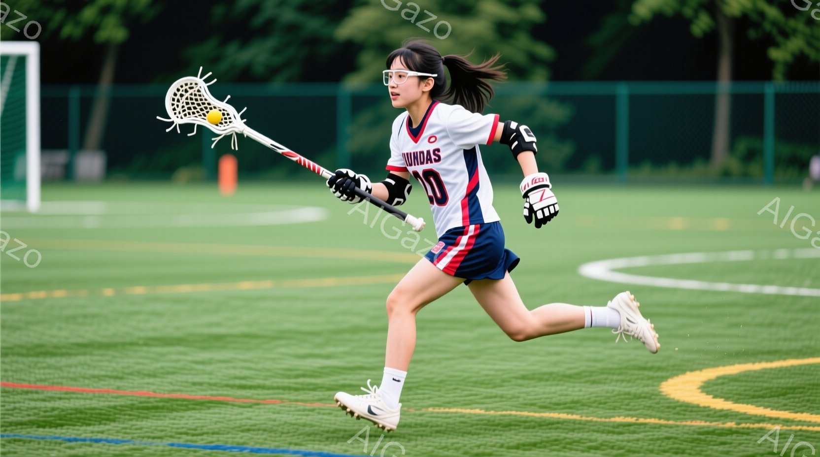 ラクロスをする若い女性選手が写っている。彼女は白と紺色のユニフォームに「20」の数字、ヘルメットを着用し、ラクロススティックを構えながら芝生の上を走っている。背景には緑の芝生、ラクロスのゴール、そしてぼやけた木々が見え、晴れた日の活気ある競技の様子が伝わってくる。