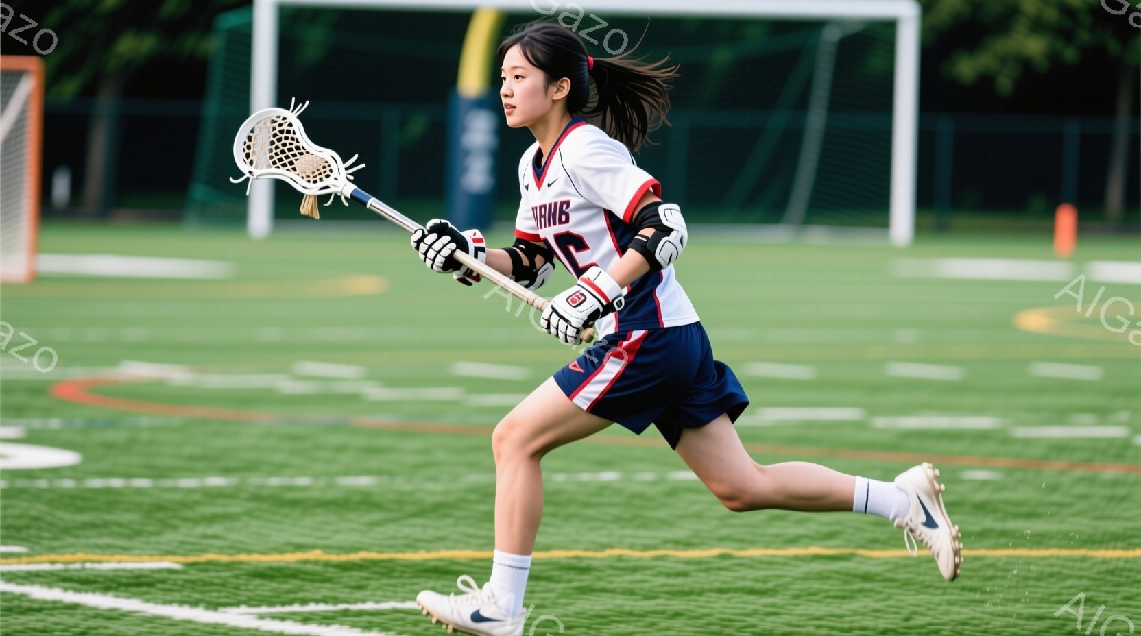 ラクロスをする若い女性アスリートが写っている。彼女は白とネイビーのユニフォームに、黒いヘアバンドをしており、髪はポニーテールに結ばれている。鮮やかな緑の芝生の上を走り、ラクロスのスティックを高く構え、競技に集中した表情をしている。
