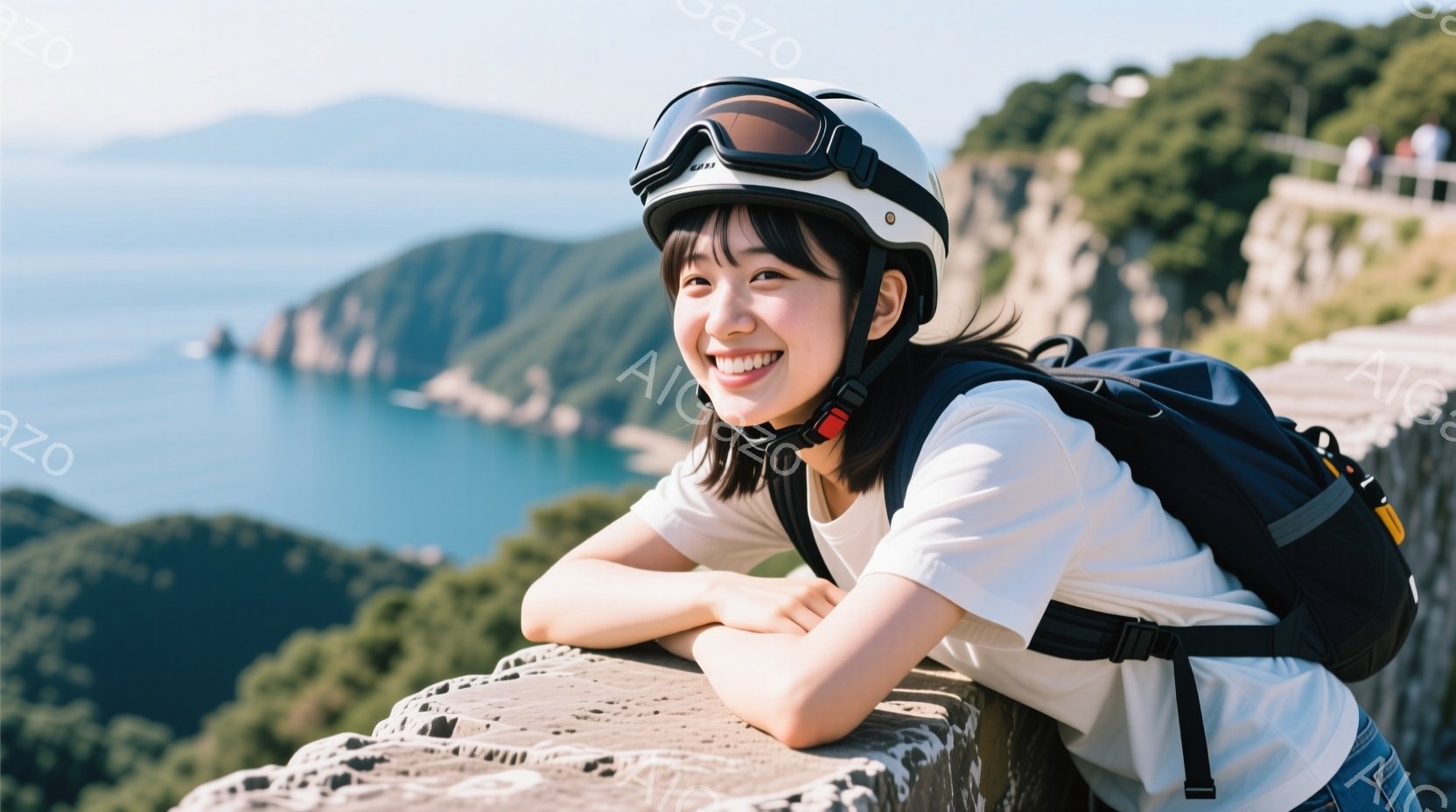 ヘルメットを被った若い女性が、崖の上に横たわって微笑んでいます。彼女は白いシャツを着ており、髪は肩にかかる長さで、前髪が目にかかっています。背景には、青い海と緑豊かな崖、そして遠くに見える建物があり、晴れた日の穏やかな雰囲気が感じられます。