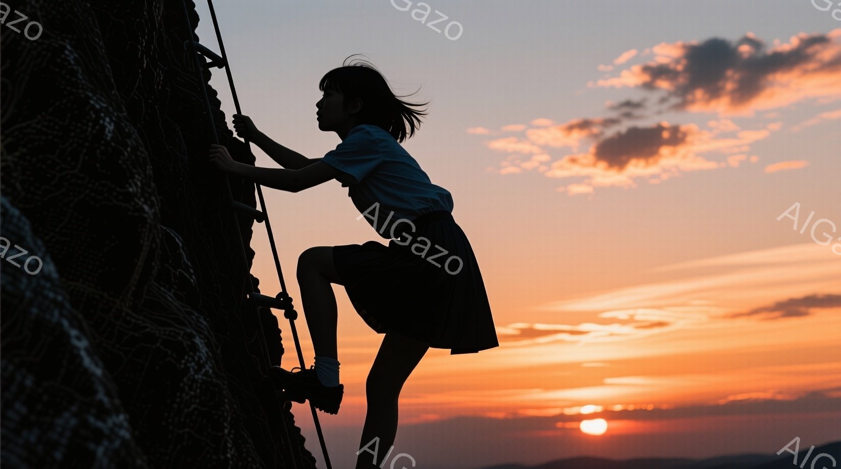 シルエットで描かれた少女が、険しい岩肌をよじ登っている様子が印象的だ。彼女は短めの髪を持ち、白いトップスと短いスカート、そしてハイキングシューズを着用しており、力強く岩にしがみついている。背景は燃えるような夕焼け空で、太陽が沈みかけており、全体的に力強さと希望を感じさせる雰囲気である。