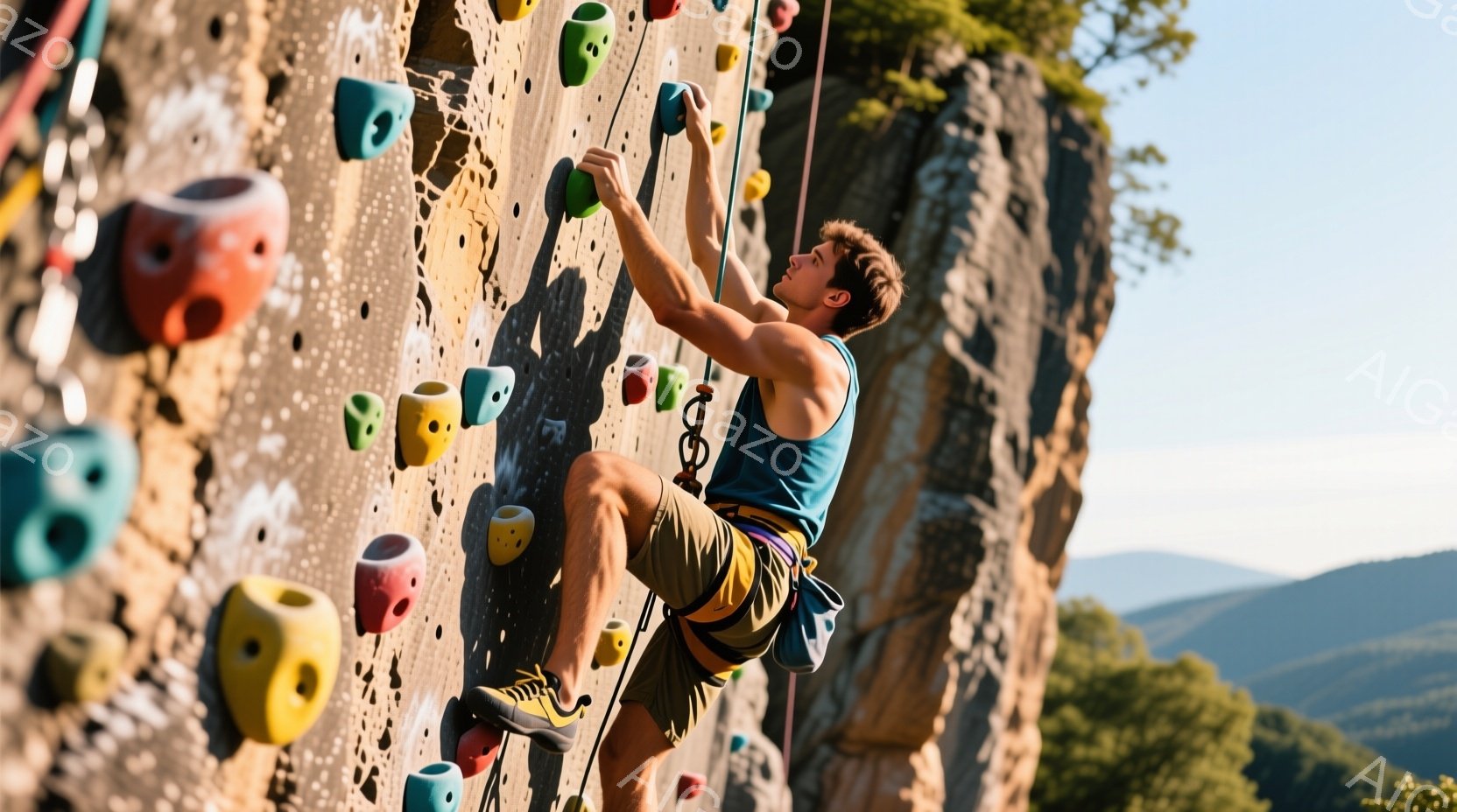 筋骨隆々の男性がクライミングウォールを登っている様子が写っている。彼は黒いTシャツと黒いショートパンツを着用し、ハーネスを締めている。背景は晴れた青空で、クライミングウォールは様々な色のホールドが付いており、活気のある雰囲気を感じさせる。
