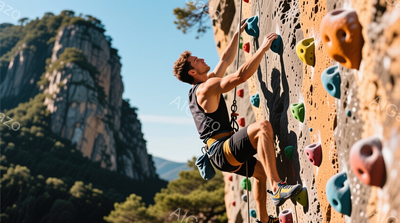 筋骨隆々の男性がクライミングウォールを登っている様子が写っている。彼は黒のタンクトップと黄色と青のショートパンツを着用し、集中した表情で岩壁につかまっている。背景には緑豊かな山々が広がり、晴天の下、活気に満ちたアウトドアスポーツの雰囲気が漂っている。