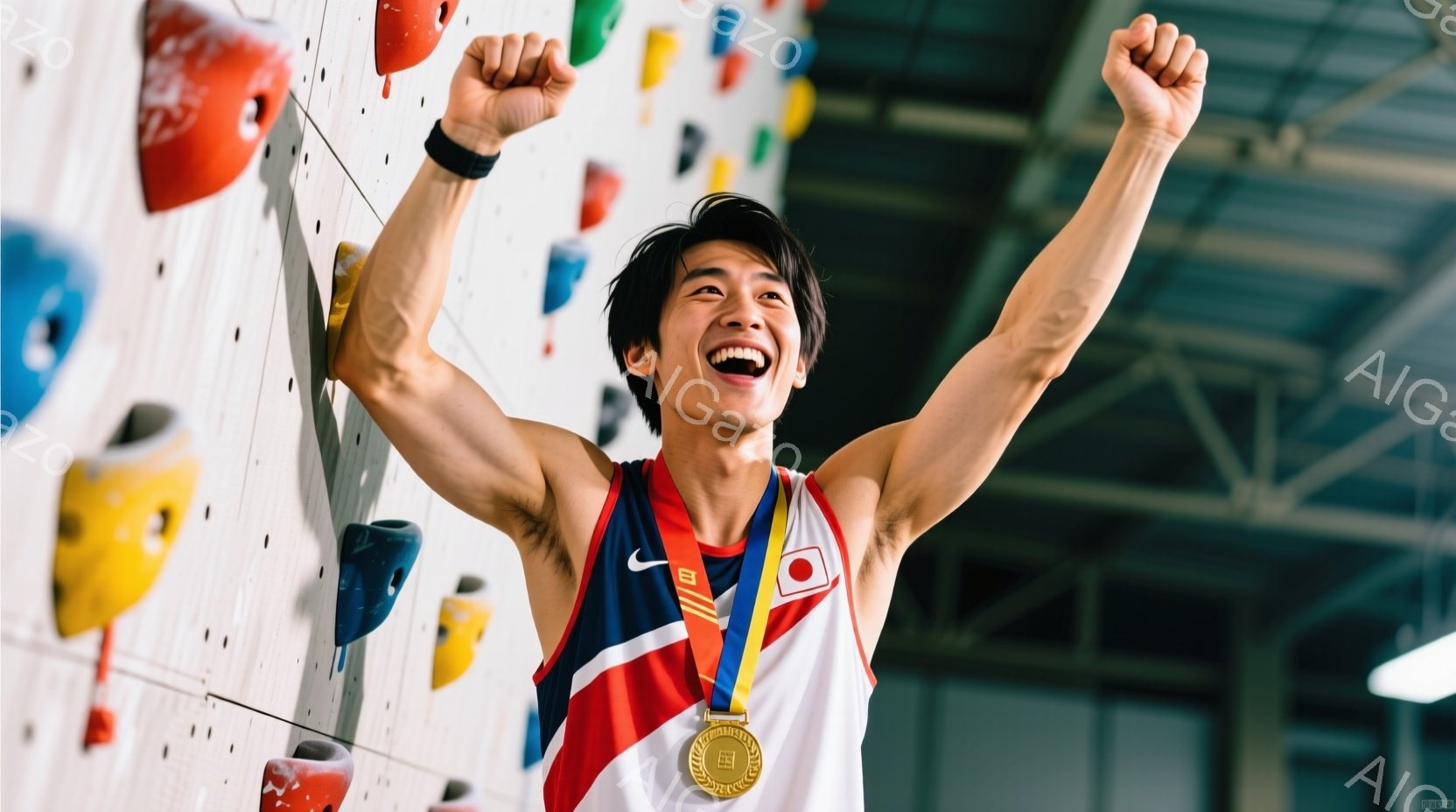 若い男性がクライミングウォールを背景に、両腕を高く上げて歓喜している様子が写っている。彼は白いタンクトップと黒いショーツを着用し、首には金メダルをかけている。背景にはカラフルなクライミングホールドと、ぼやけた自然や建物が見え、晴天の下、勝利の喜びを感じさせる活気に満ちた雰囲気である。