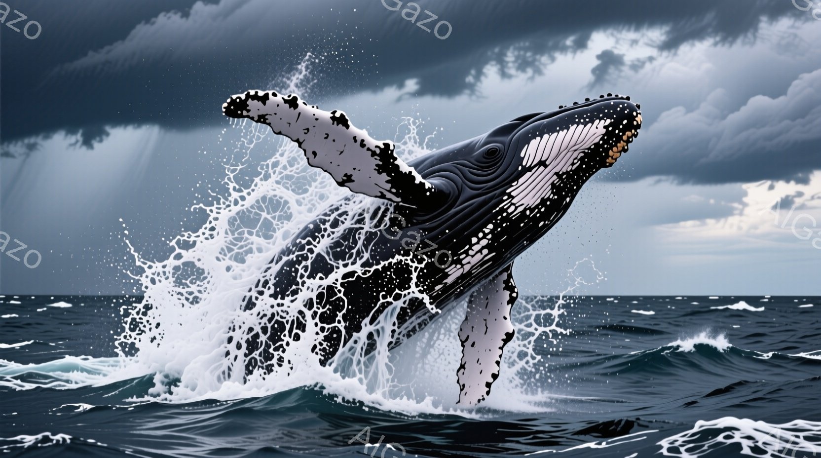 深い藍色の海面から、巨大なザトウクジラが躍動的に飛び上がっている様子が捉えられています。白い水しぶきがクジラの黒い体に当たり、その力強い躍動感を強調しています。背景には暗い雲が広がり、ドラマチックな雰囲気を醸し出しています。