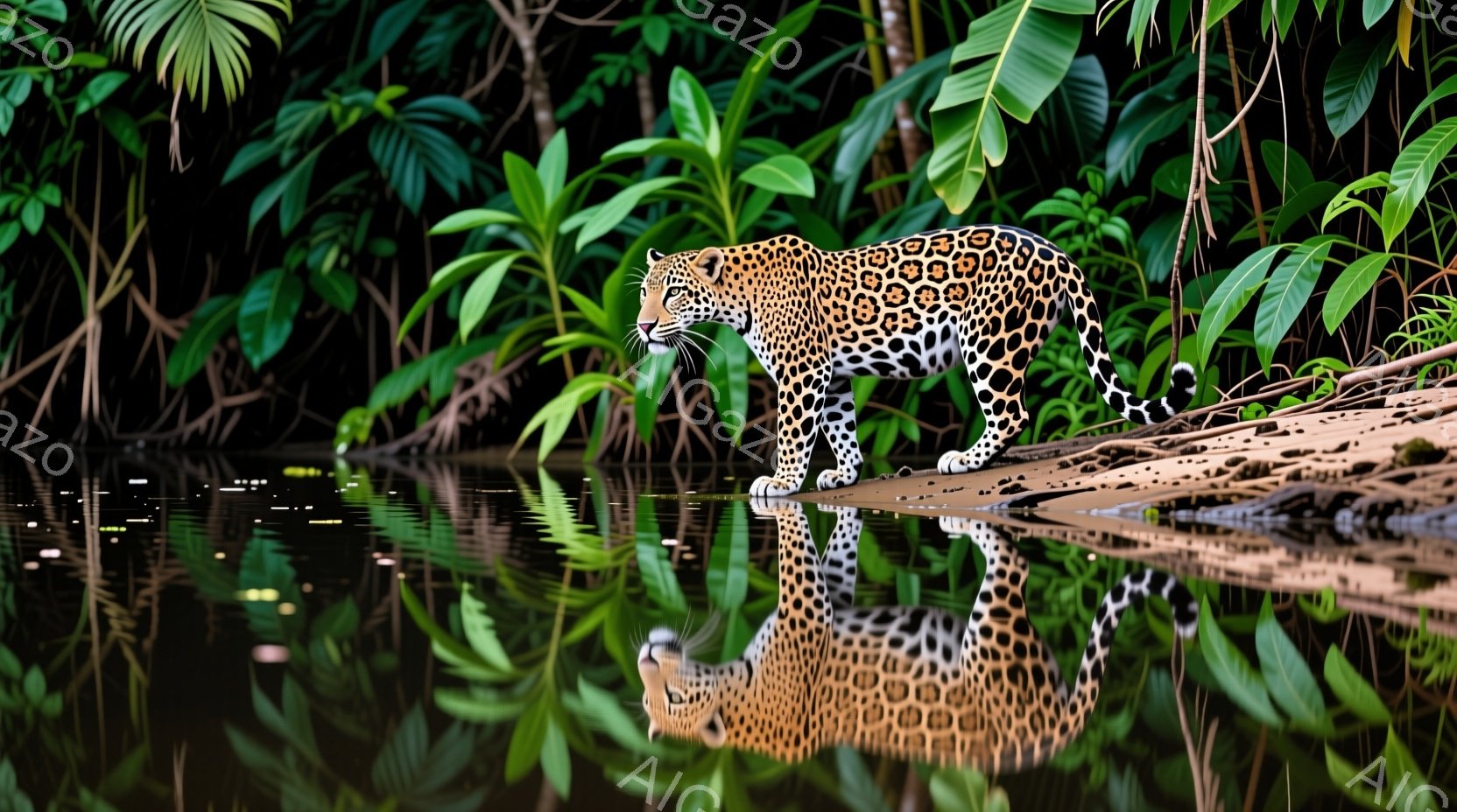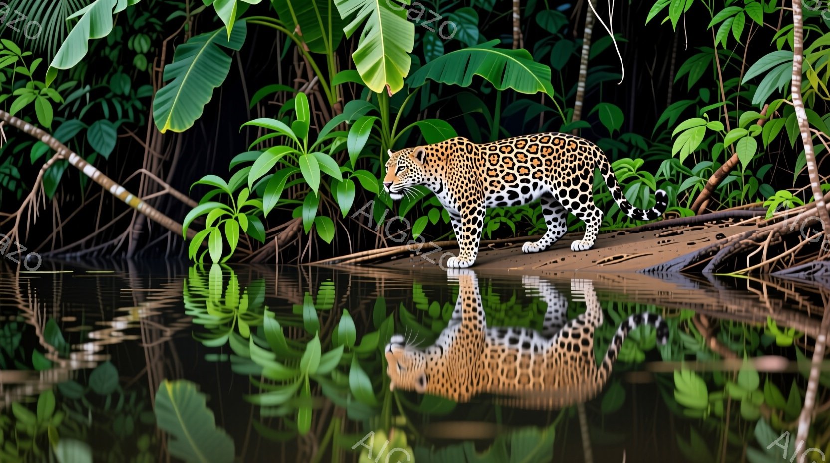 ジャガーが茶色い河岸の上に立ち、水面にその姿を映している。背景には緑豊かな熱帯雨林の植物が生い茂り、湿った空気と緑の生命力に満ちた雰囲気である。水面にはジャガーの鮮明な反射が映り込み、まるで鏡のように二匹のジャガーが存在しているかのような幻想的な光景を作り出している。
