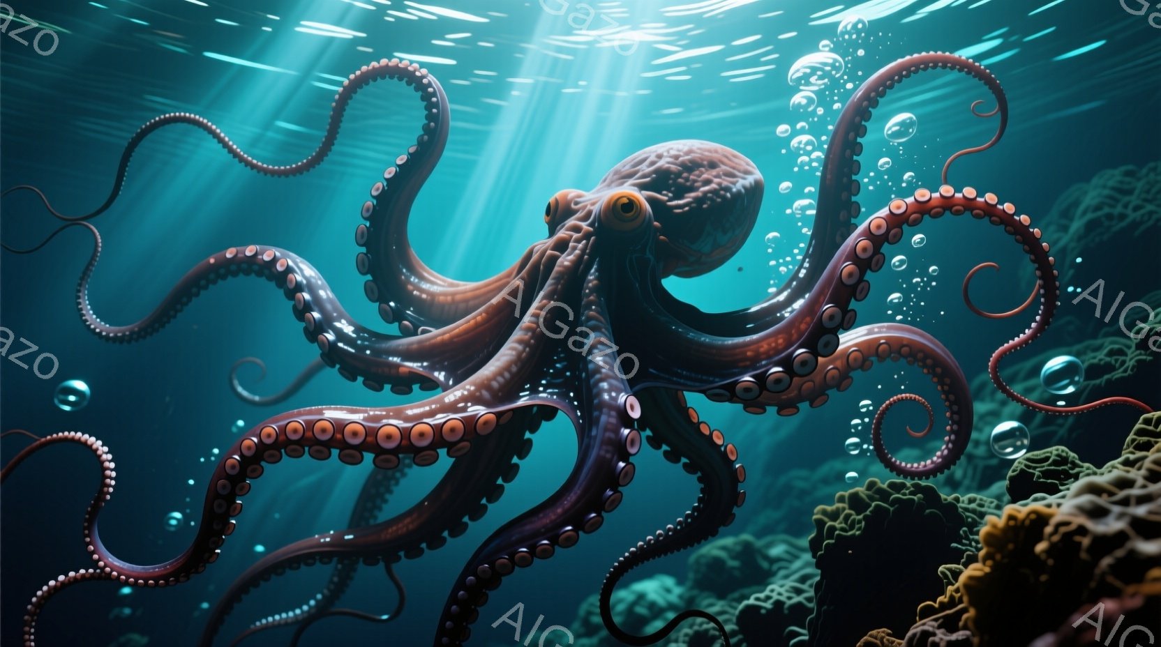 深い青色の海中に巨大なタコが描かれている。タコは触手を広げ、暗赤色の肌は水中で不気味な光沢を放っている。背景にはサンゴ礁が広がり、水中に漂う泡と光線が幻想的な雰囲気を醸し出している。