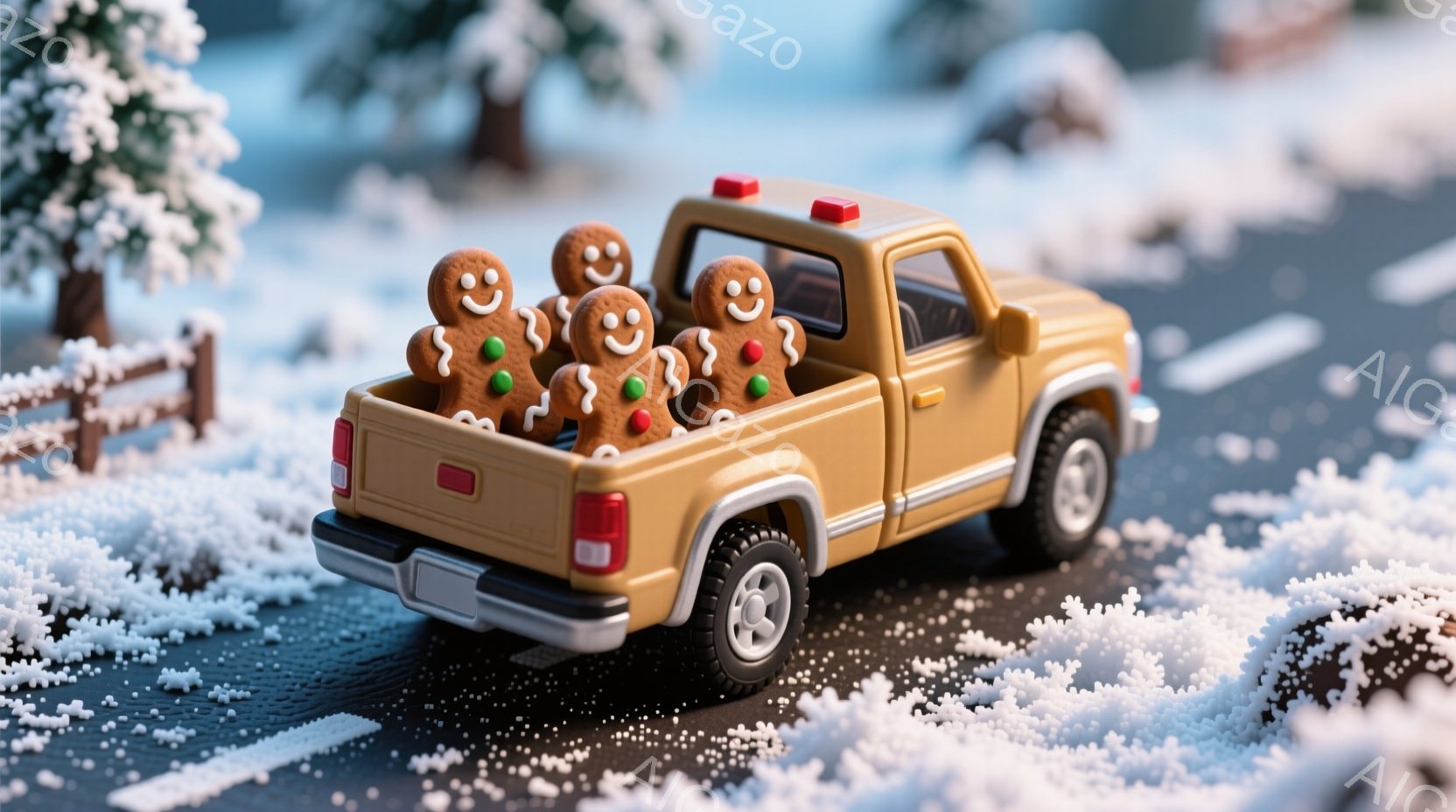ミニチュアの黄色いピックアップトラックの荷台に、ジンジャーブレッドマンたちが乗っています。彼らは緑のリボンで飾り付けられ、皆笑顔で楽しそうに立っています。背景には雪で覆われた道路と、小さな木々や標識があり、まるで冬のミニチュアの世界のようです。