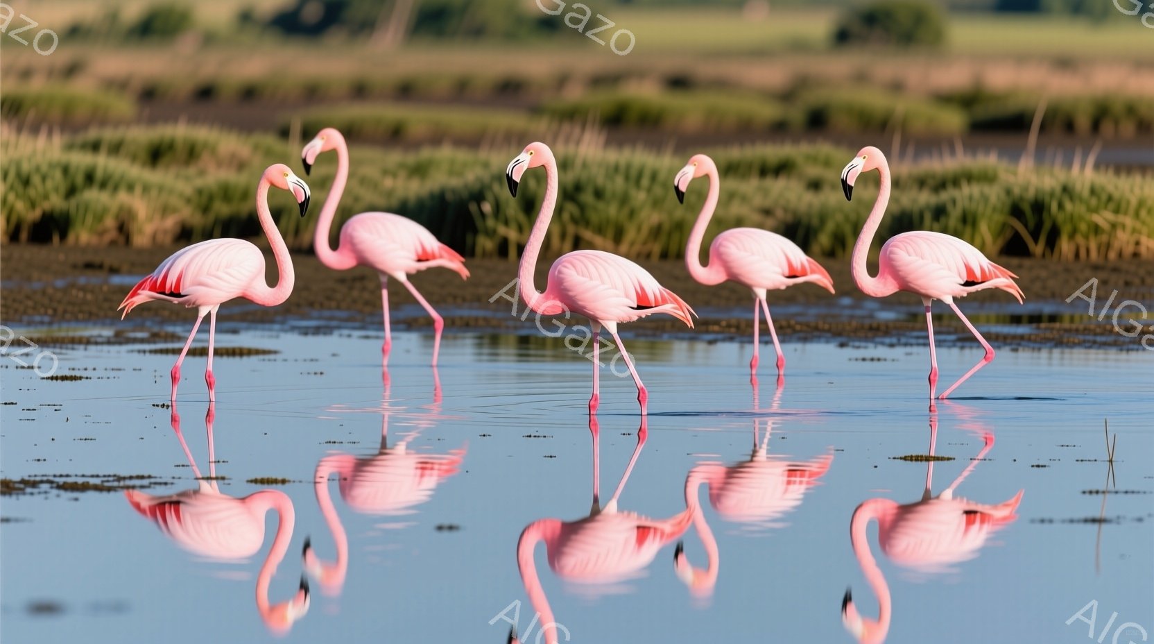 ピンク色のフラミンゴが、水面に映る姿を鏡のように映し出しています。彼らは片足で立ち、首を長く伸ばして周囲を警戒しているようです。背景には緑色の植生が広がり、穏やかな水面が広がる静かな自然の風景が広がっています。
