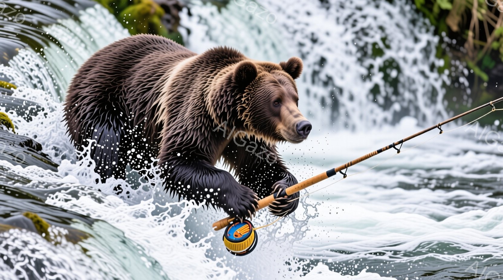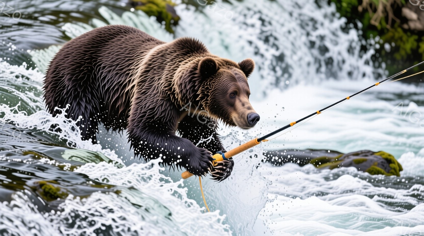 熊が激しい流れの川を渡っている様子が写っている。水しぶきが飛び散り、熊の毛並みが濡れて光っている。背景には岩場と緑豊かな植生が見られ、自然の力強さと野生の雰囲気を醸し出している。