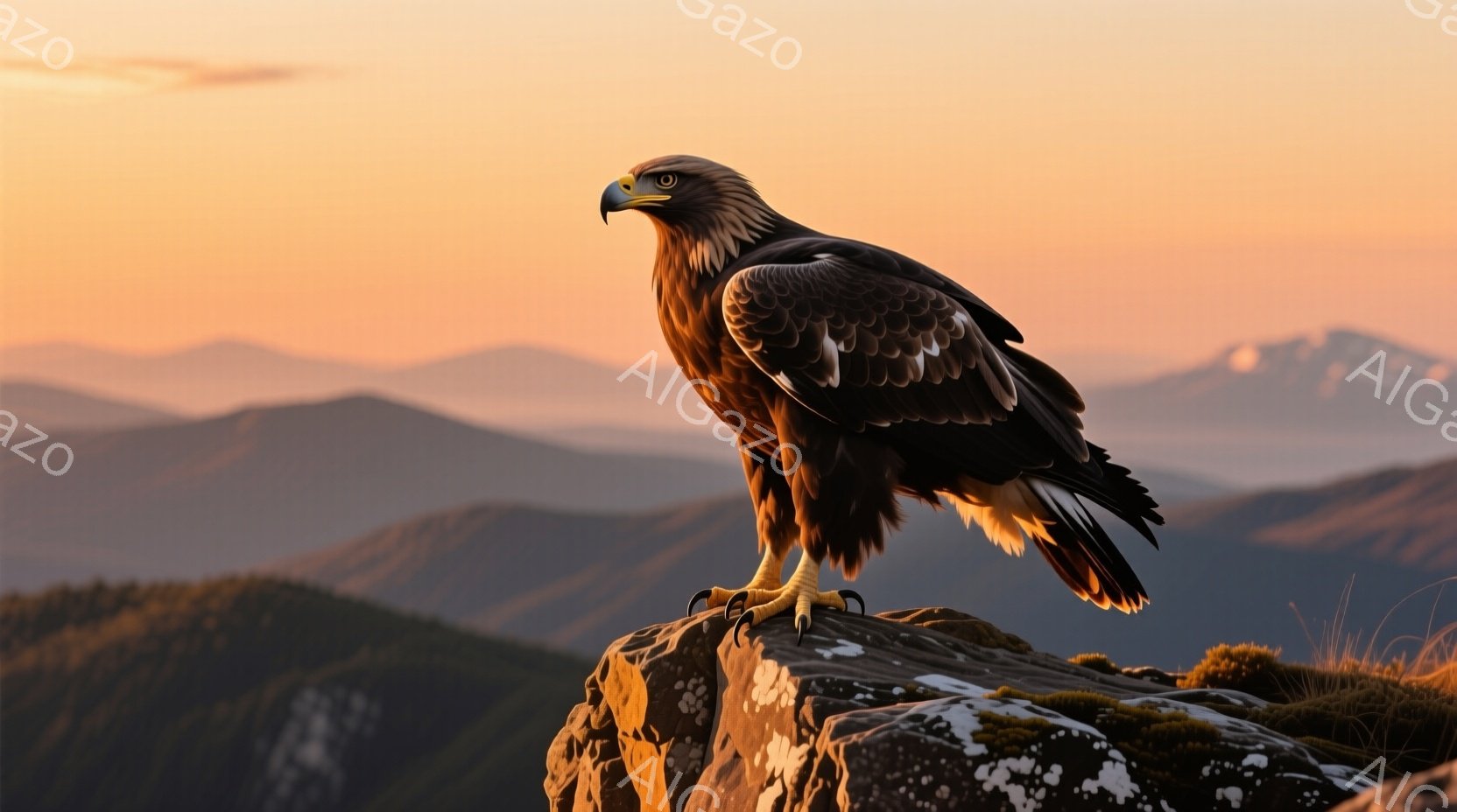 巨大なワシが、苔むした岩の頂上に堂々と立っている。背景には、夕焼けに照らされた山々が連なり、空はオレンジと黄色のグラデーションで染まっている。ワシの鋭い眼差しと力強い爪は、自然の威厳と力強さを表現している。