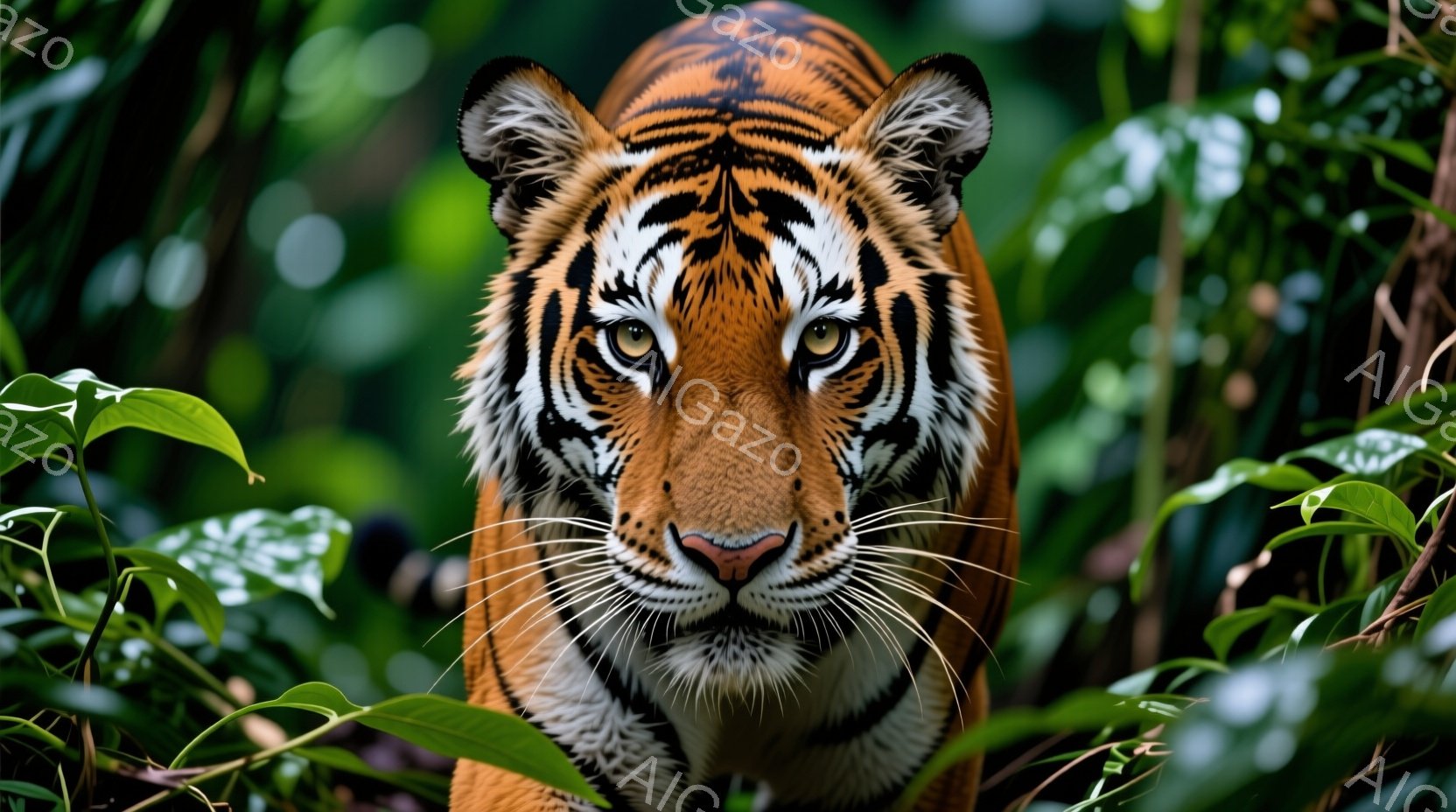 鮮やかな緑の葉に囲まれた、正面をまっすぐ見つめるトラの顔が印象的な画像です。その顔はオレンジと黒の縞模様で覆われ、鋭い眼光と白いヒゲが特徴的です。背景は深い緑色の植物で、自然の中で力強く生きるトラの存在感を際立たせています。