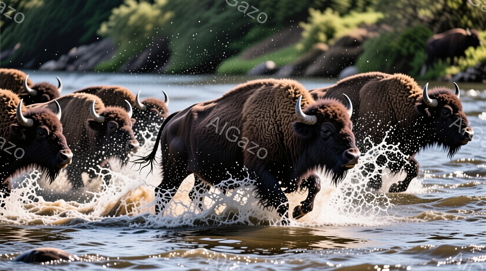 アメリカバイソンが水面を力強く駆け抜けている様子が捉えられています。水しぶきが上がり、バイソンの筋肉質な体躯と荒々しい毛並みが強調されています。背景には緑豊かな自然が広がり、水面を通して木々が見え、疾走感と野生の力強さを感じさせる光景です。