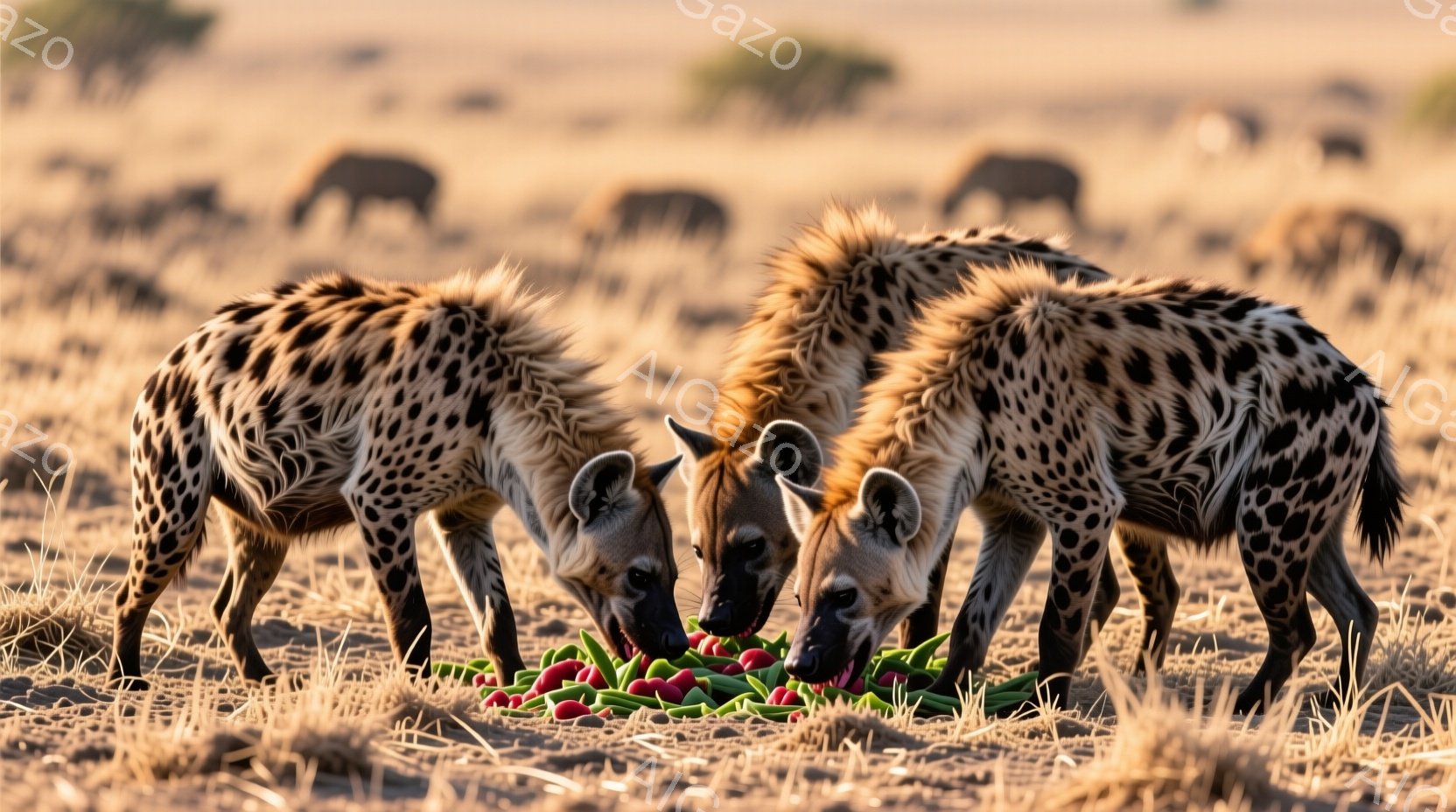 3頭のハイエナが砂漠のような平原で赤い果実を食べている様子が写っている。2頭はほぼ同じ姿勢で果実の山に群がり、慎重に食べようとしているように見える。背景は乾燥した草地が広がり、暖かく乾燥した気候を感じさせる。