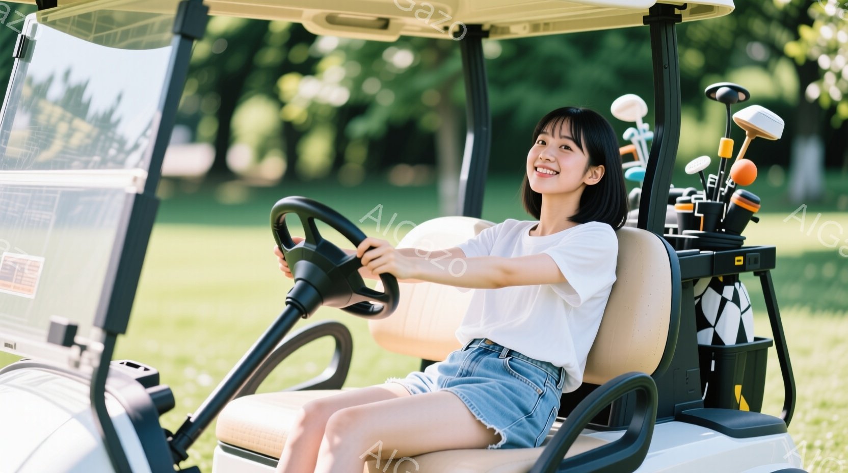 女性がゴルフを楽しむ姿勢で、背景は草地と木々。興奮の表情で感じる熱意が際立っています。