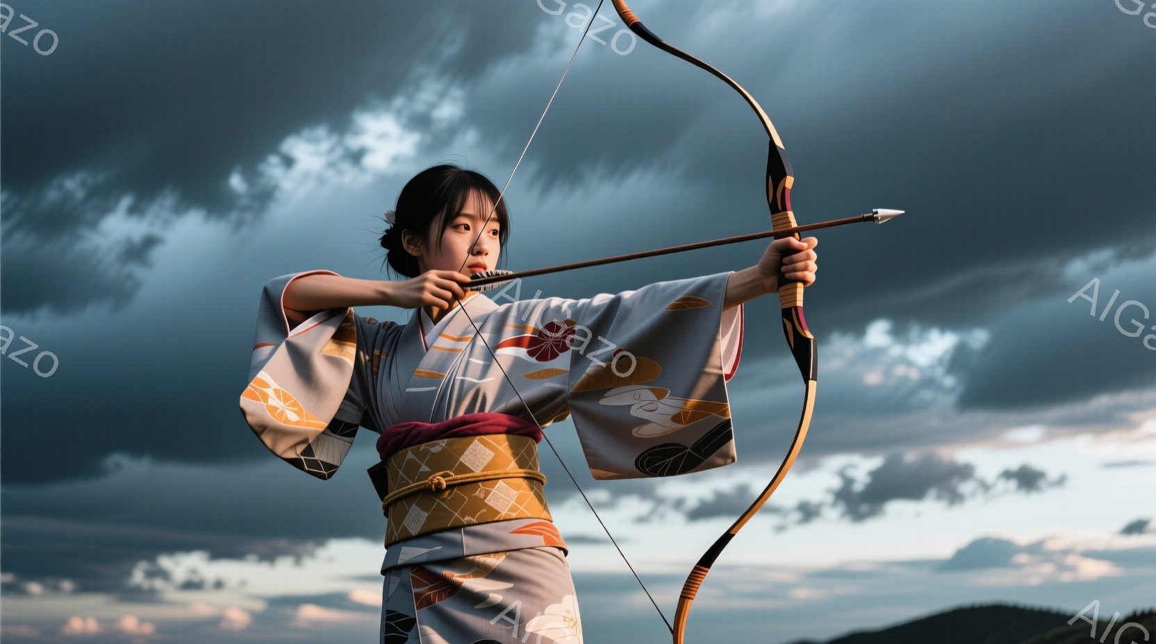 灰色の地に花柄が入った着物を着た女性が、弓を構えています。彼女は髪を後ろでまとめ、集中した表情で矢を放とうとしています。背景は夕焼けのような空で、雲が広がっており、静かで力強い雰囲気を醸し出しています。
