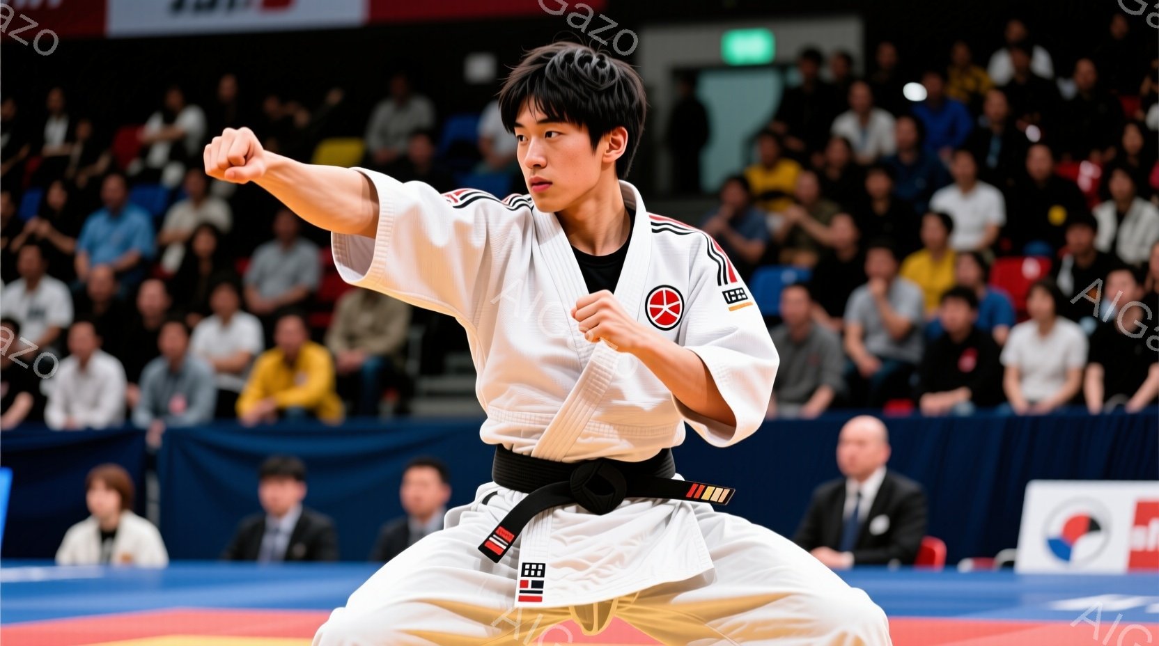 この無料AI生成画像「競技者は紺色のレオタードと赤いショーツを着用し、力強い表情で両手を拳にして構えています。膝を曲げ、腰を落とした姿勢は、まさに試合開始を待つアスリートの迫力を表現しています。背景には観客席が広がり、活気あふれる競技場の雰囲気が伝わってきます。」は、2025年10月23日に作成されました。 サイズは 1664×928px の高解像度で、商用利用も可能なフリー素材として提供しています。