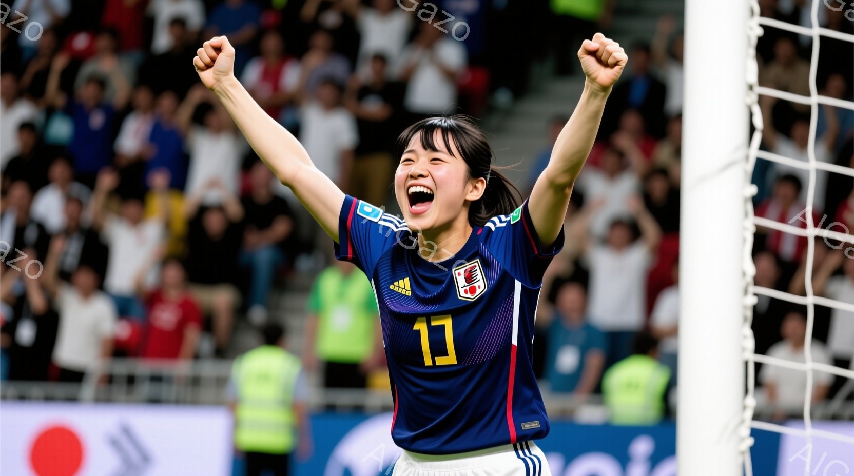 サッカーの試合で、日本代表の一人の女性選手がゴールネットの前で両手を高く挙げ、歓喜の表情を浮かべている。白いユニフォームには「13」の番号が書かれ、短く黒い髪は興奮で少し乱れている。背景には観客席が見え、活気に満ちたスタジアムの雰囲気が伝わってくる。