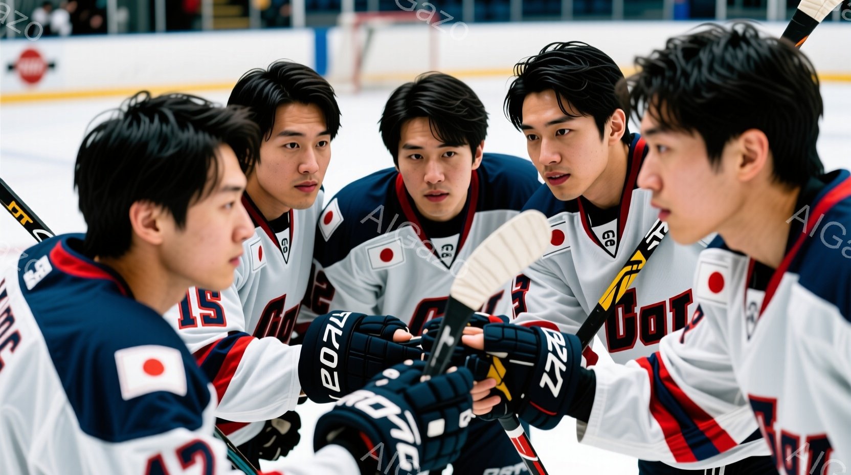 4人の若い男性がアイスホッケーの練習中に身を寄せ合っている様子が写っている。彼らは皆、日本代表のエンブレムが入った白いホッケーユニフォームと黒いグローブを着用し、真剣な表情で中央に置かれたホッケーパックを見つめている。背景はアイスホッケーリンクで、リンクの壁には広告が表示されており、チームの結束力と集中力が感じられる雰囲気である。