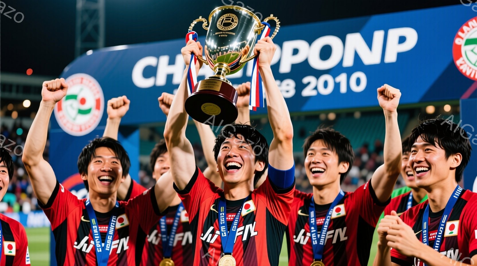 選手たちが勝利のトロフィーを高く掲げ、満面の笑みを浮かべている様子が写っている。白いユニフォームに赤いラインと青いアクセントが入っており、首にはメダルがかけられている。背景にはぼやけた観客席と広告が見え、勝利の喜びと興奮に満ちた雰囲気が伝わってくる。