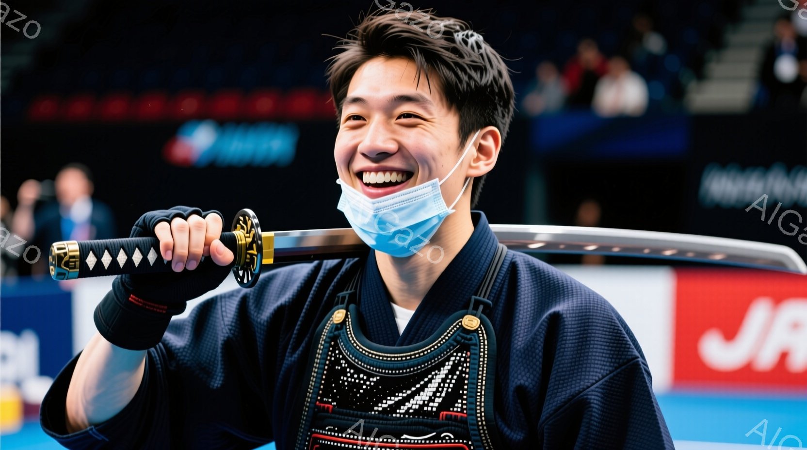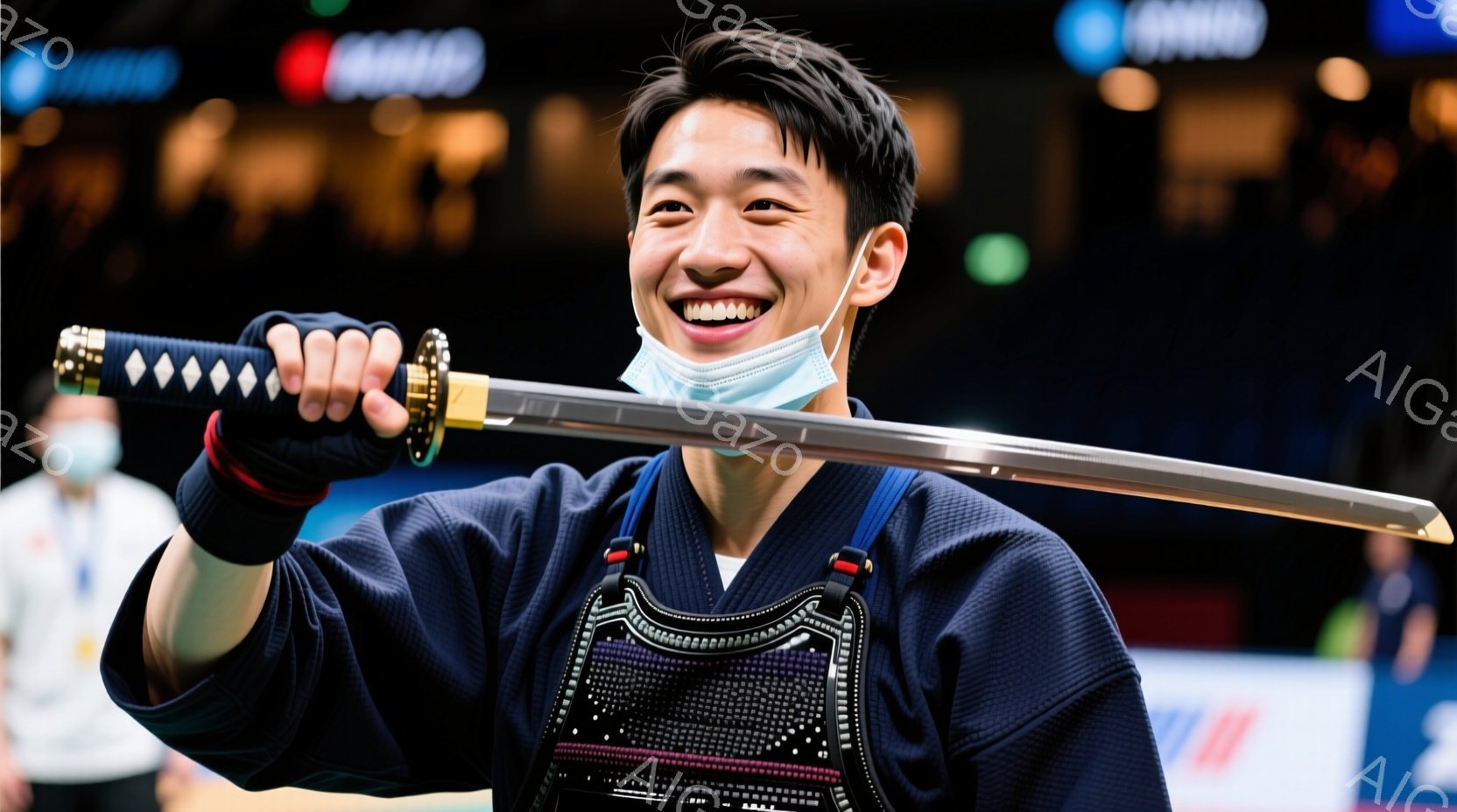 若い男性が剣を高く掲げ、満面の笑みを浮かべている。彼は黒色の防具と着物を着用し、マスクをしている。背景には観客席が見え、スポーツイベントのような会場であることがわかる。