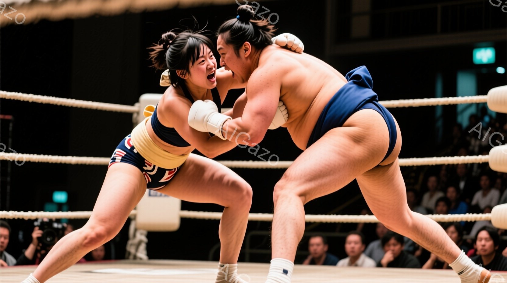 この無料AI生成画像「力士二人が相撲の取り組み中で、激しい組み合いをしている様子が捉えられています。一人は黒地に白の花模様の廻し、もう一人はオレンジと金色の模様の廻しを締め、力強い表情で相手に組み付いています。背景にはぼやけた観客席が見え、競技場のリングとロープが確認できます。」は、2025年10月23日に作成されました。 サイズは 1664×928px の高解像度で、商用利用も可能なフリー素材として提供しています。