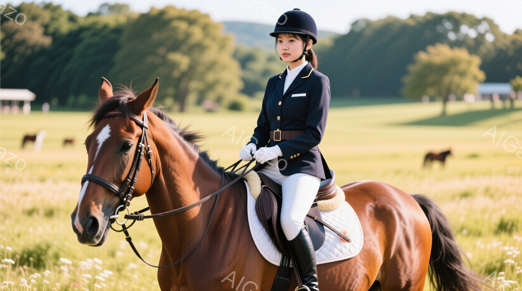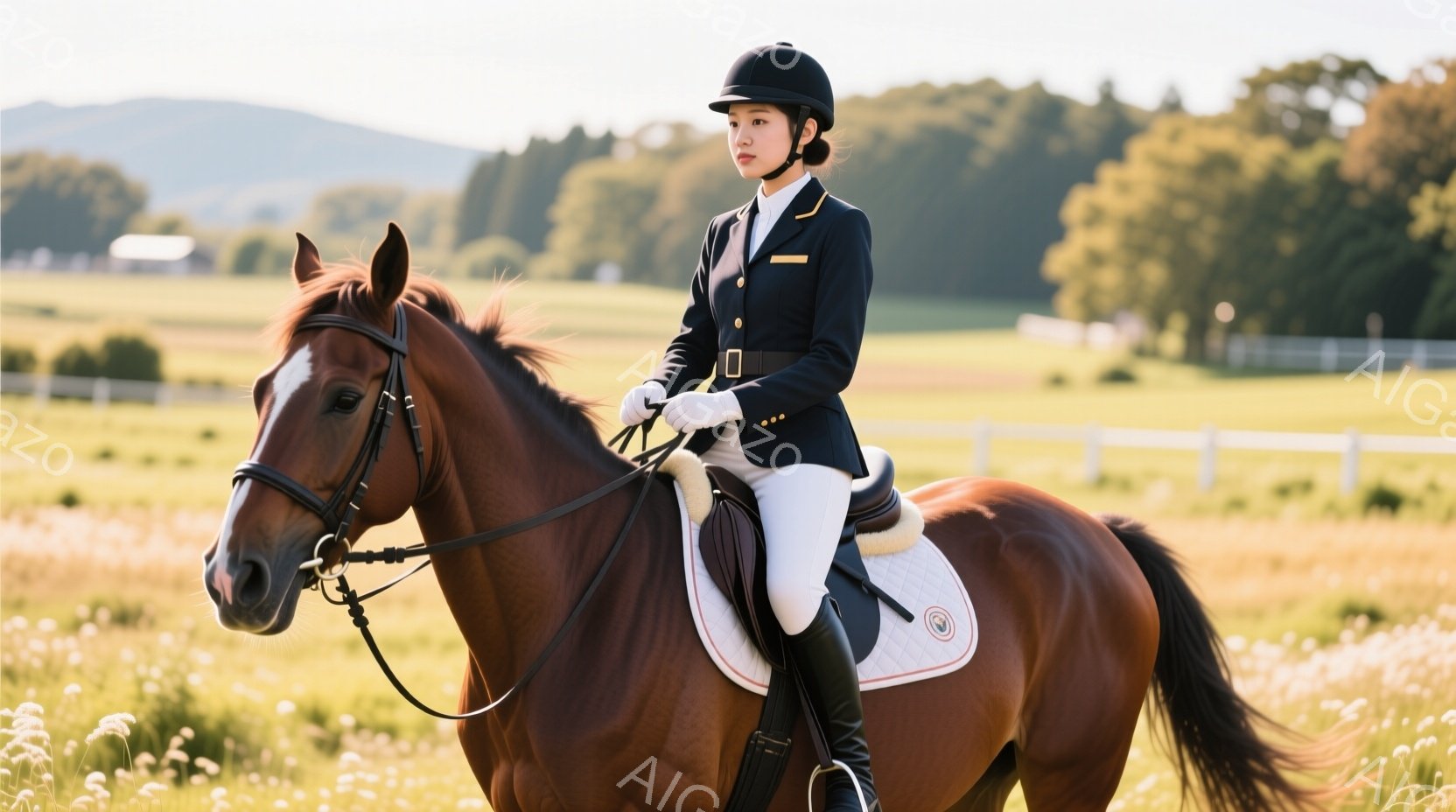 栗色の馬に乗った女性が写っている。彼女は紺色のジャケット、白いズボン、黒いブーツという乗馬ウェアを着用し、黒いヘルメットをかぶっている。背景は緑豊かな牧草地で、遠くに白いフェンスと木々が見え、晴天の下、穏やかで優雅な雰囲気が漂っている。