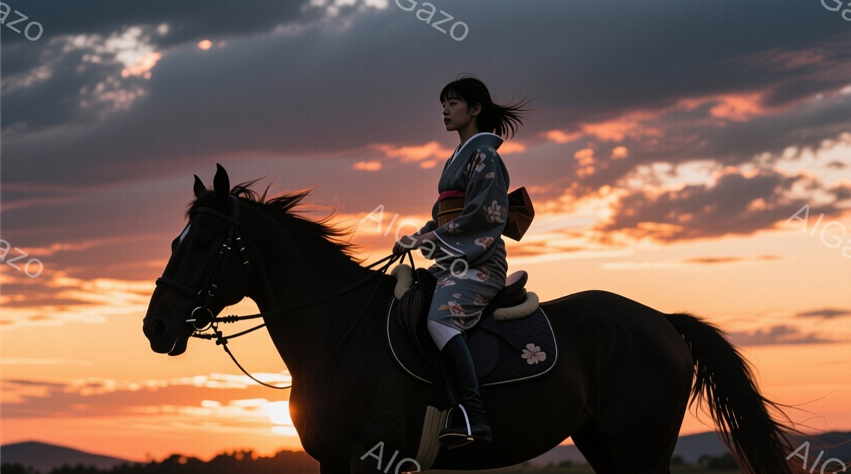黒い馬に乗った女性が夕焼けを背景にシルエットで描かれている。女性は白い服と赤い帯を身につけ、髪は風になびいている。背景には燃えるような夕焼け空と、遠くに見える建物や草原が広がり、力強く美しい雰囲気を醸し出している。