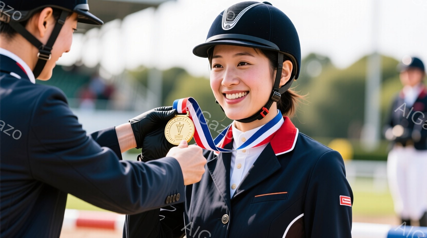競技会でメダルを受け取る女性の姿を捉えています。彼女は黒いヘルメットを被り、ネイビーのジャケットと白いシャツを着て、笑顔を見せています。背景には緑豊かな自然と、他の競技者らしき人物が見え、晴れた日の勝利の瞬間を表現しています。