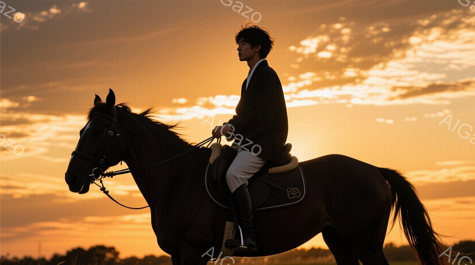 この無料AI生成画像「濃い夕焼けを背景に、黒い馬に乗った男性が描かれています。男性は黒いジャケット、ベージュ色のズボン、そして黒いブーツを着用し、整髪された黒髪が特徴的です。馬と男性はシルエットとして描かれており、夕焼けのオレンジ色と馬の黒色がコントラストをなしています。」は、2025年10月23日に作成されました。 サイズは 1664×928px の高解像度で、商用利用も可能なフリー素材として提供しています。