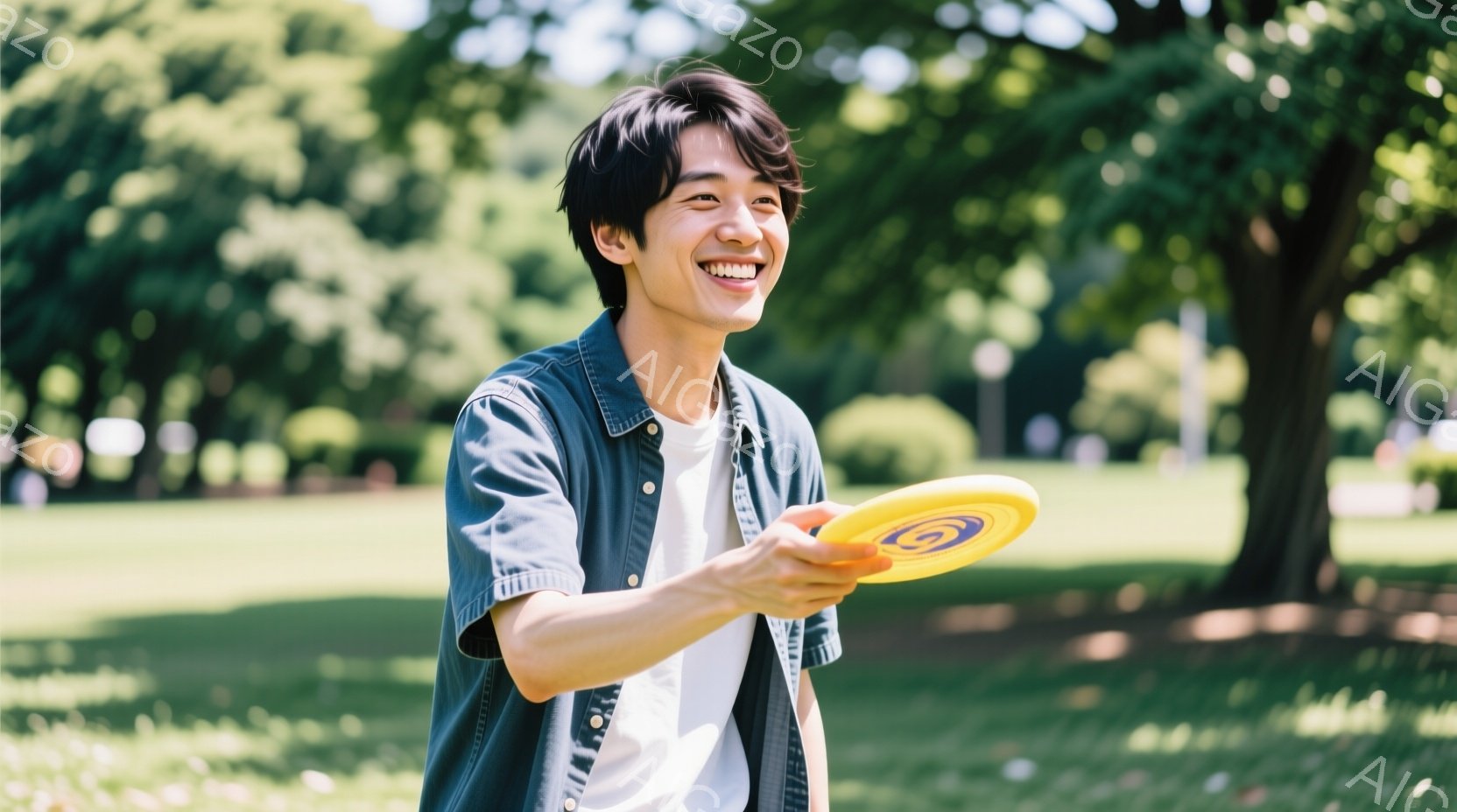 若い男性が青いデニムシャツと白いTシャツを着て、芝生の上に立っています。彼は笑顔で、カラフルなフリスビーを前に突き出して持っており、投げようとしている様子です。背景には緑豊かな木々が見え、晴れた日の穏やかな雰囲気が漂っています。