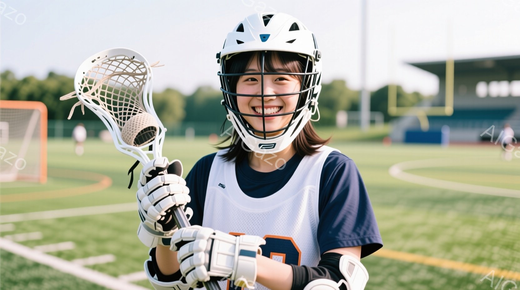 ラクロスをする若い女性が写っている。彼女は黒いヘルメットと黒いジャージを着ており、背中には「15」の数字が大きく書かれている。彼女はラクロスのスティックを持って微笑んでおり、背景には緑のフィールドとぼやけた建物が見える、明るい晴天の日で、活気に満ちた雰囲気である。